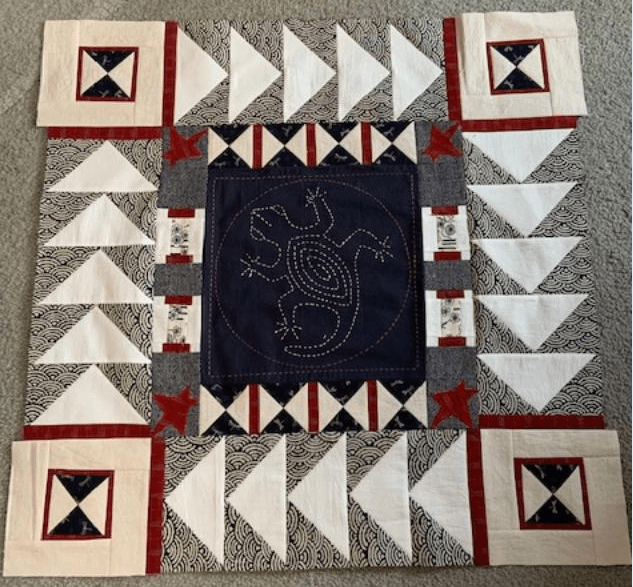 This is what Chere has to say, “Playing catch up on this . My centre block is a Japanese Sashiko block which I did the running stitch in cream and red. Had purchased a few Japanese cotton fabrics to go with block, but not much. Hoping to keep it small so I’ll have enough fabric left .”