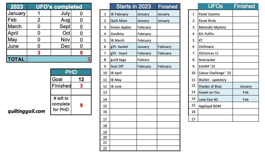 6 projects were started this month. One project started in January was finished and 1 that was started in February. They are both Gifts of the Month projects. I also started and finished the “Dust Off a Quilt Book” project, but I can’t show you that until the blog hop on the 7th.
