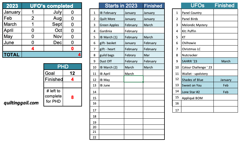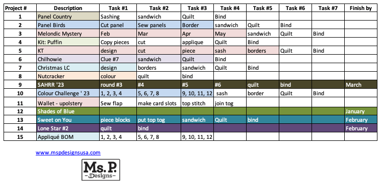 Here’s my Task Sheet of my UFOs. This helps me keep track of what I’ve accomplished and what I need to do.