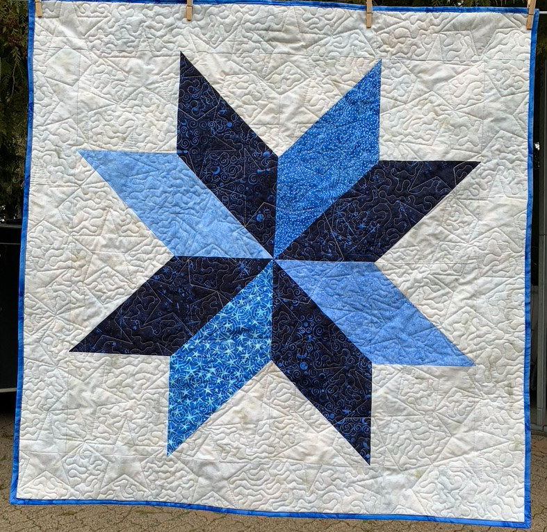 This quilt was made with left-overs from the Lone Star that I made earlier in the year. It used the fabric collection “Naturescape,” solid grey and a blender. I made a pieced back, using a few more of the left-overs and various Island Batik grey solids. You can read more about it HERE.