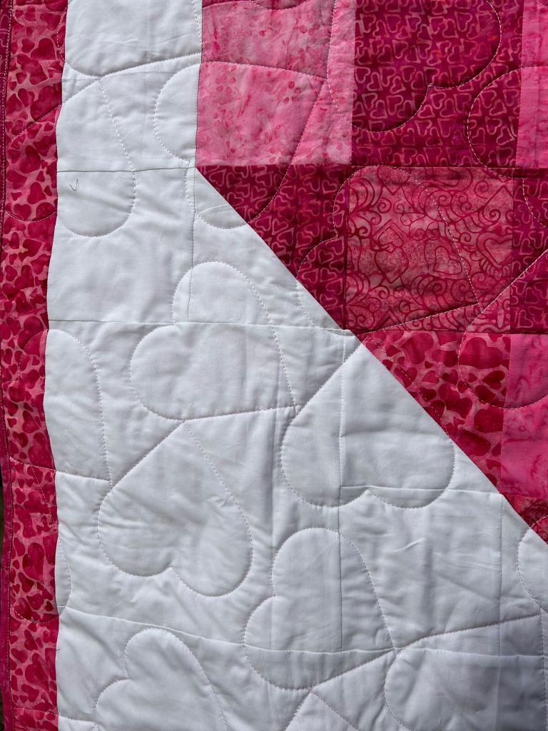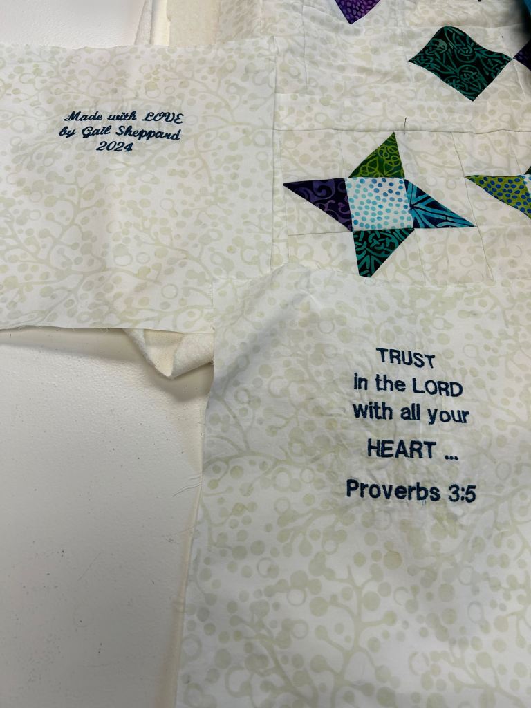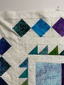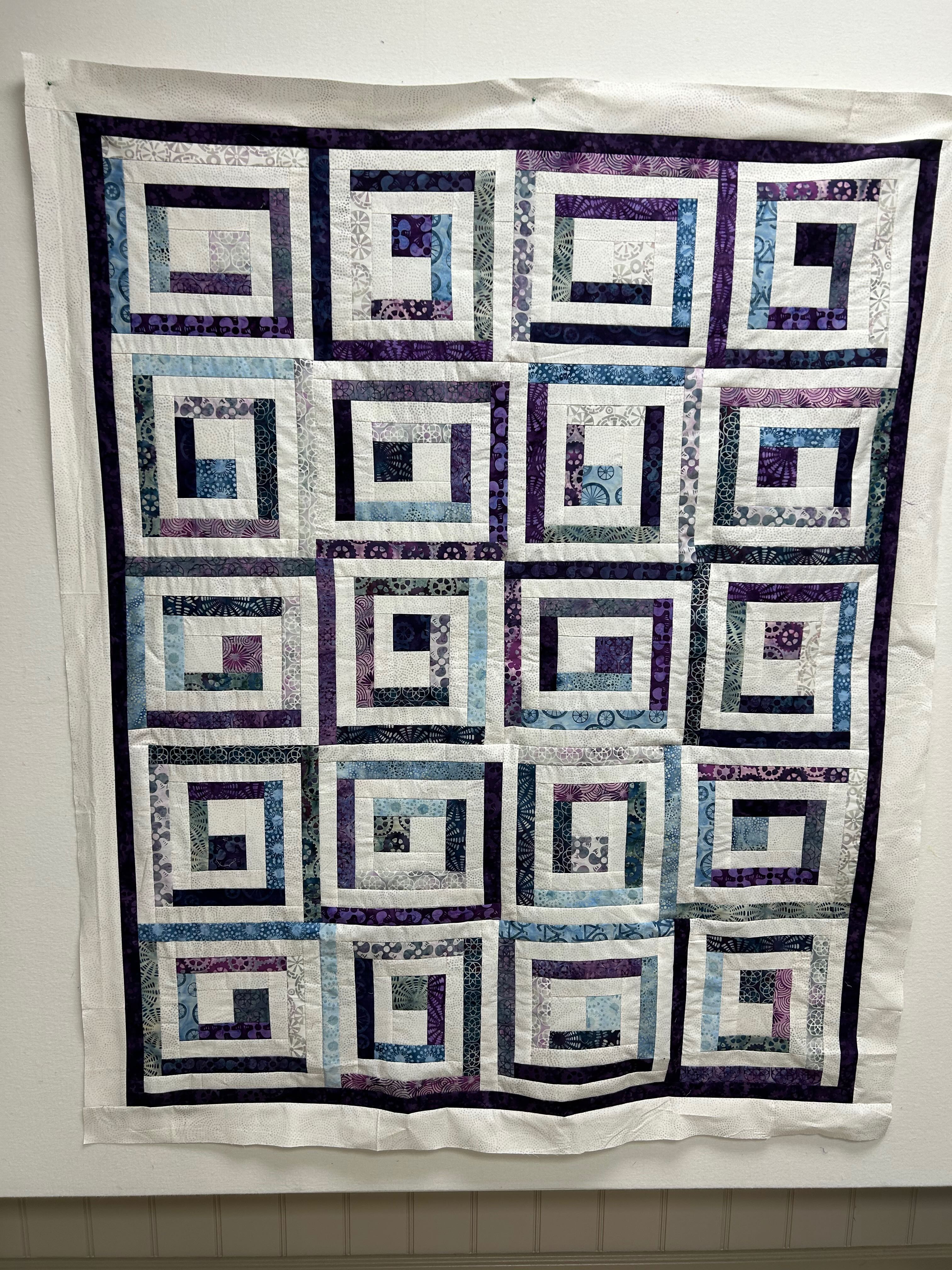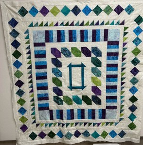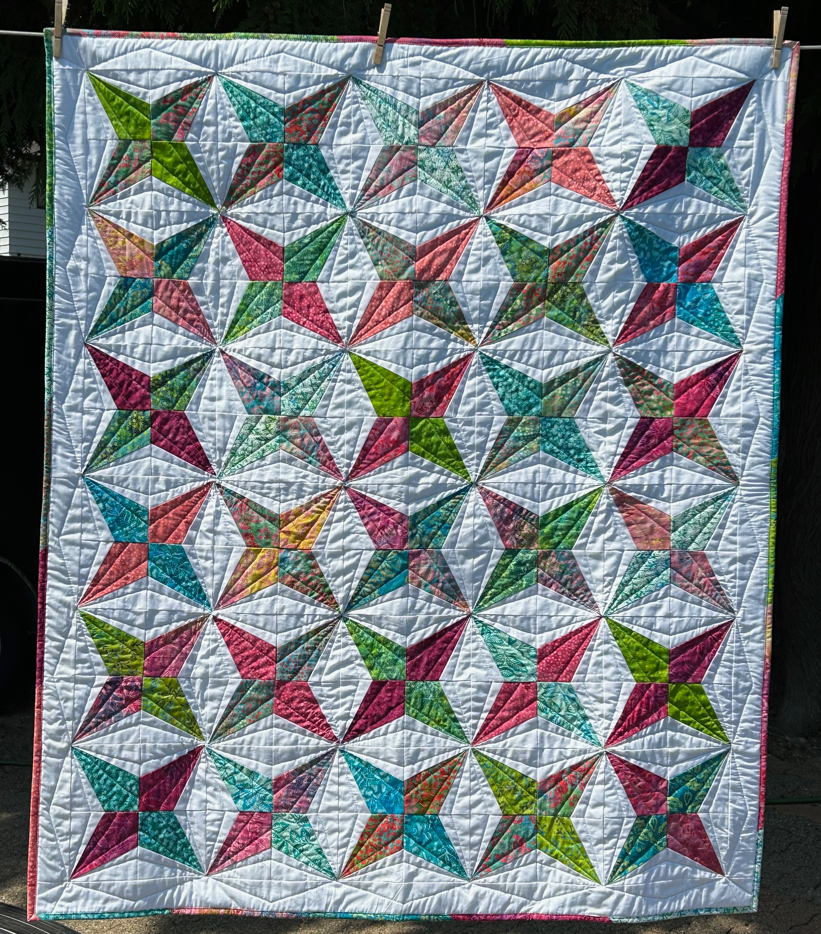 The white set off the beautiful fabrics from the collection. I was happy! I used Hobbs 80/20 batting and quilted it with Silly Moon “Rocket” to make the straight lines. It is bound with a scrappy binding with left-over pieces. It is 44″ x 52.”