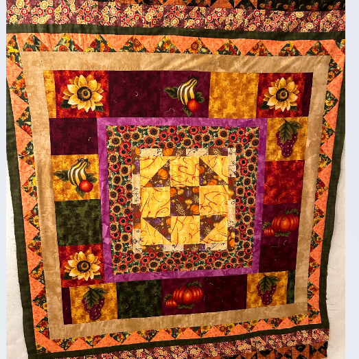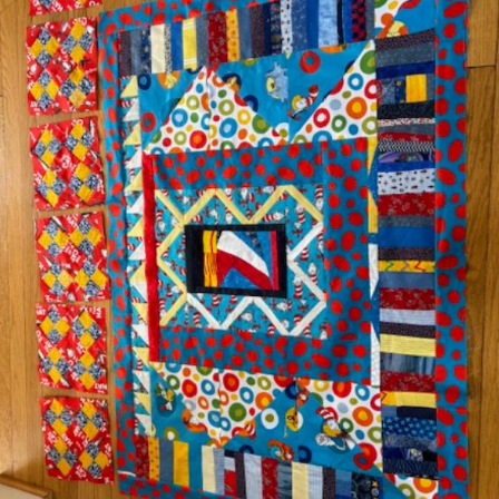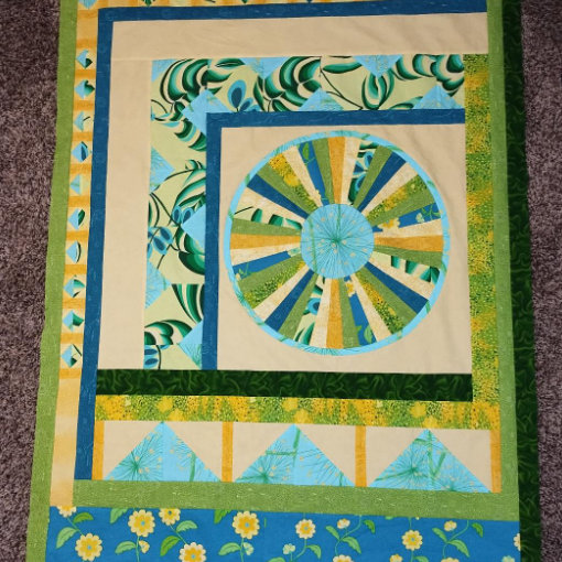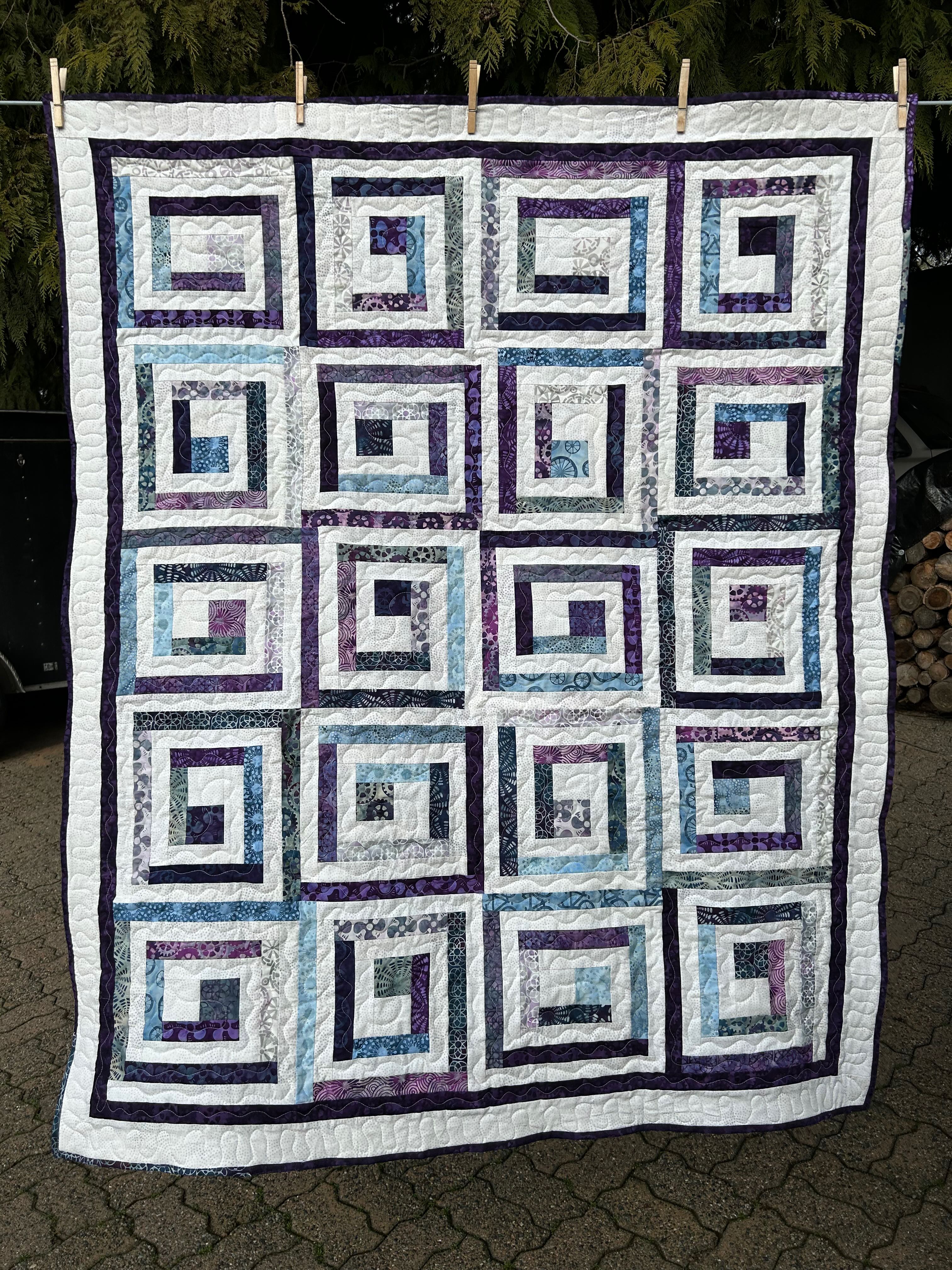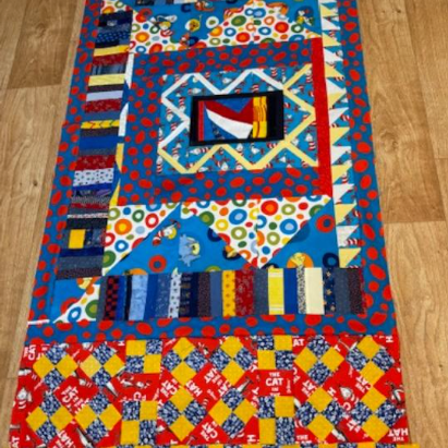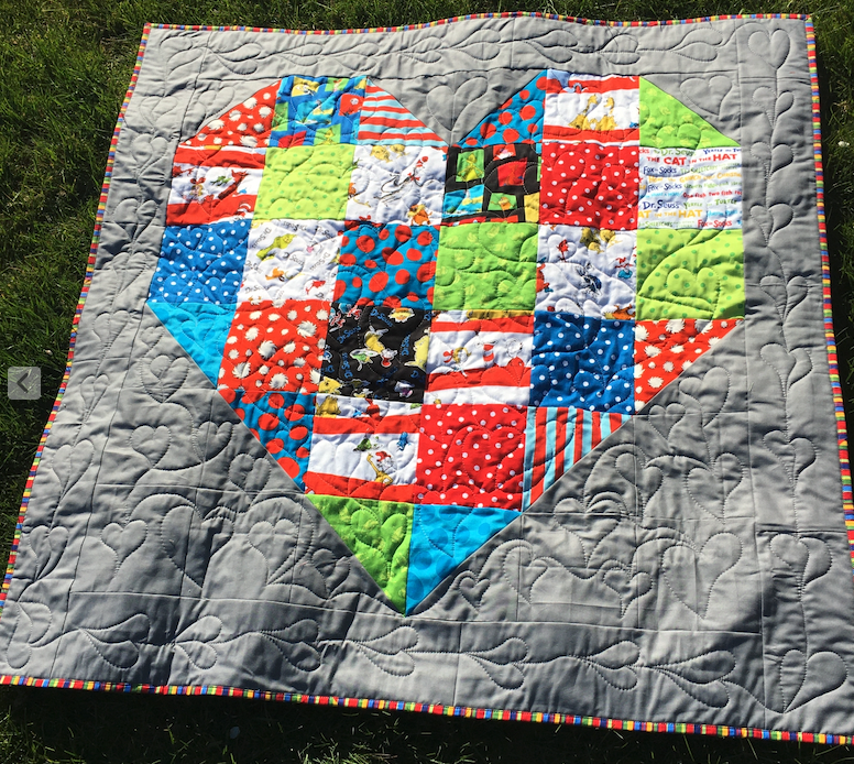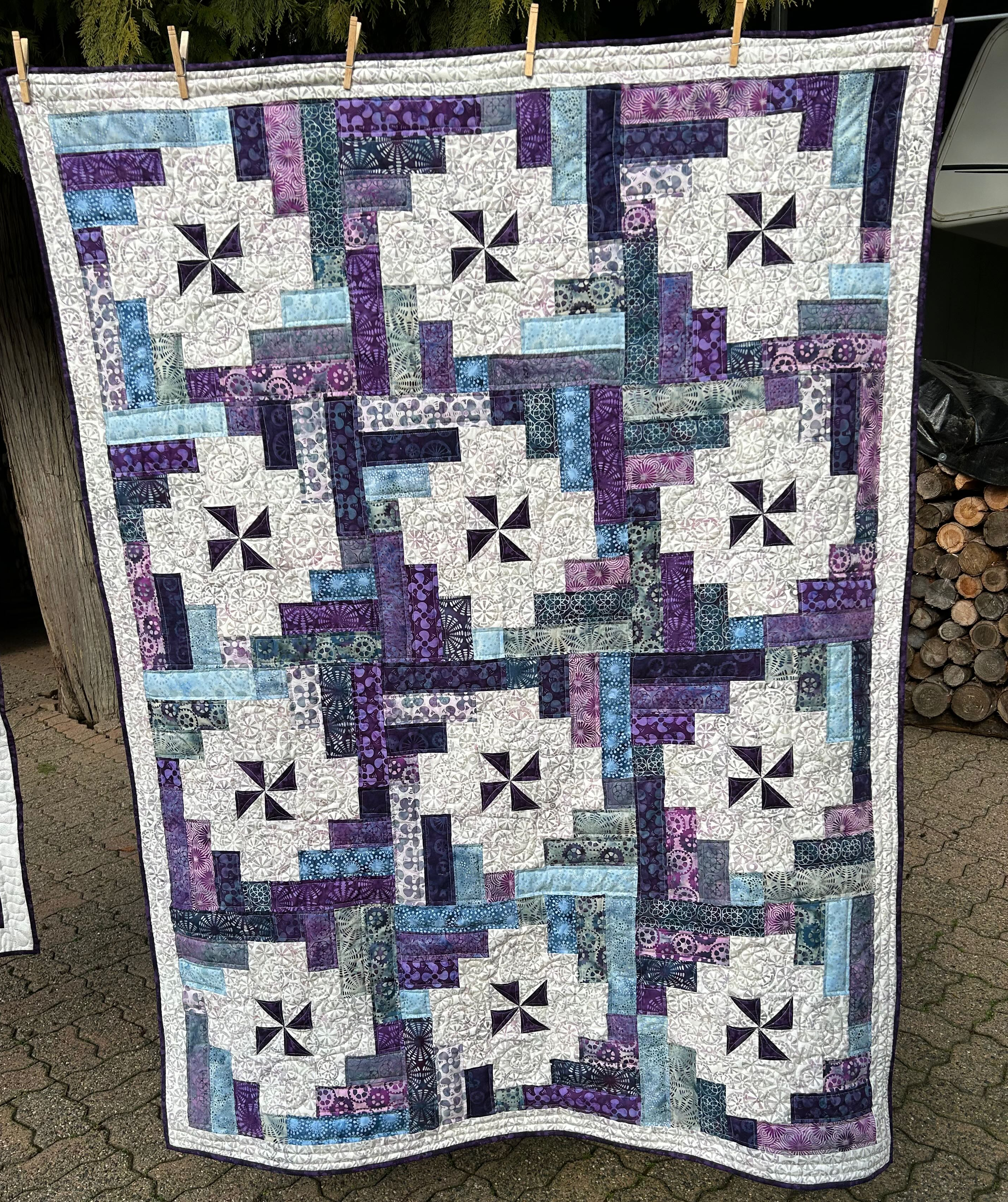 The white set off the beautiful fabrics from the collection. I was happy! I used Hobbs 80/20 batting and quilted it with Silly Moon “Rocket” to make the straight lines. It is bound with a scrappy binding with left-over pieces. It is 44″ x 52.”