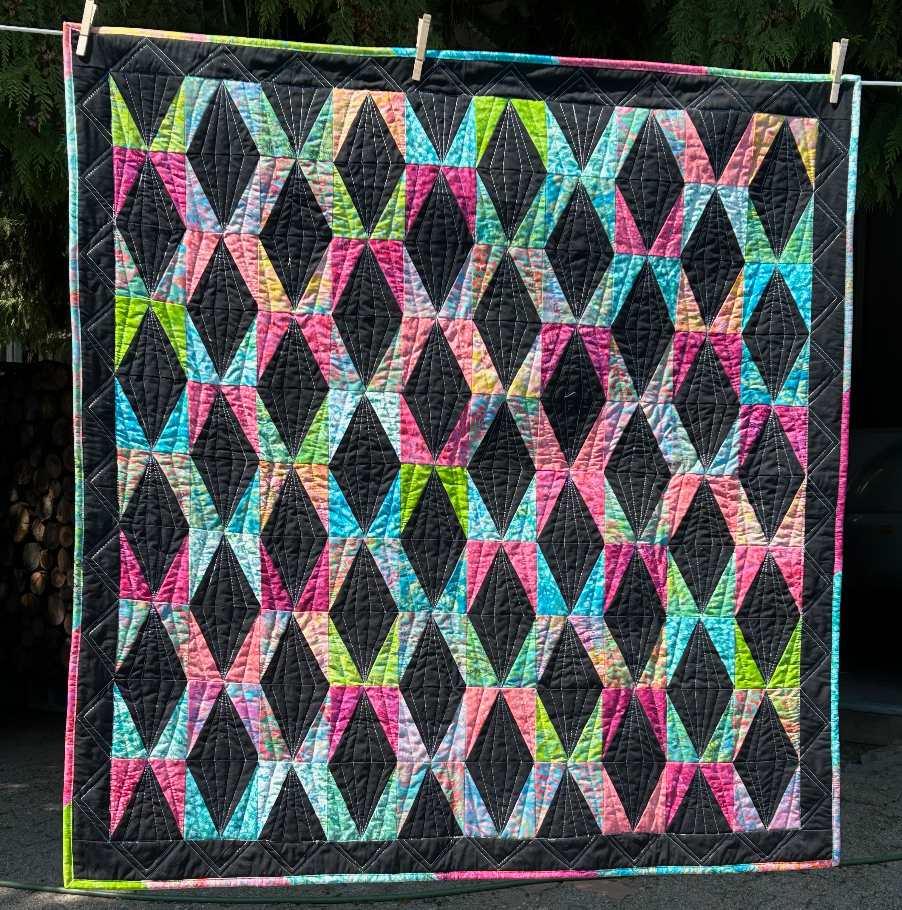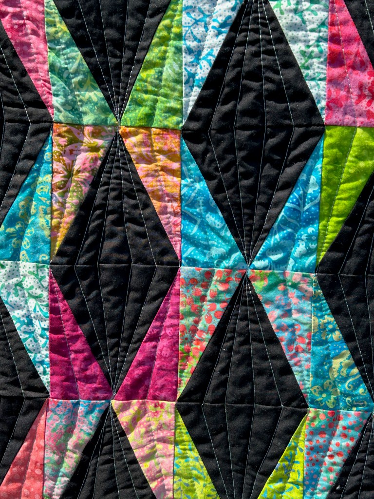 Such a different look with the same fabrics! For this one, I used Hobbs black batting. It’s perfect for dark quilts and doesn’t dull the beautiful colours! And again, I used Silly Moon’s “Rocket” for the straight line quilting. I love how the markings on the ruler make it super easy to have a pattern without marking the quilt! This quilt is 44″ square.