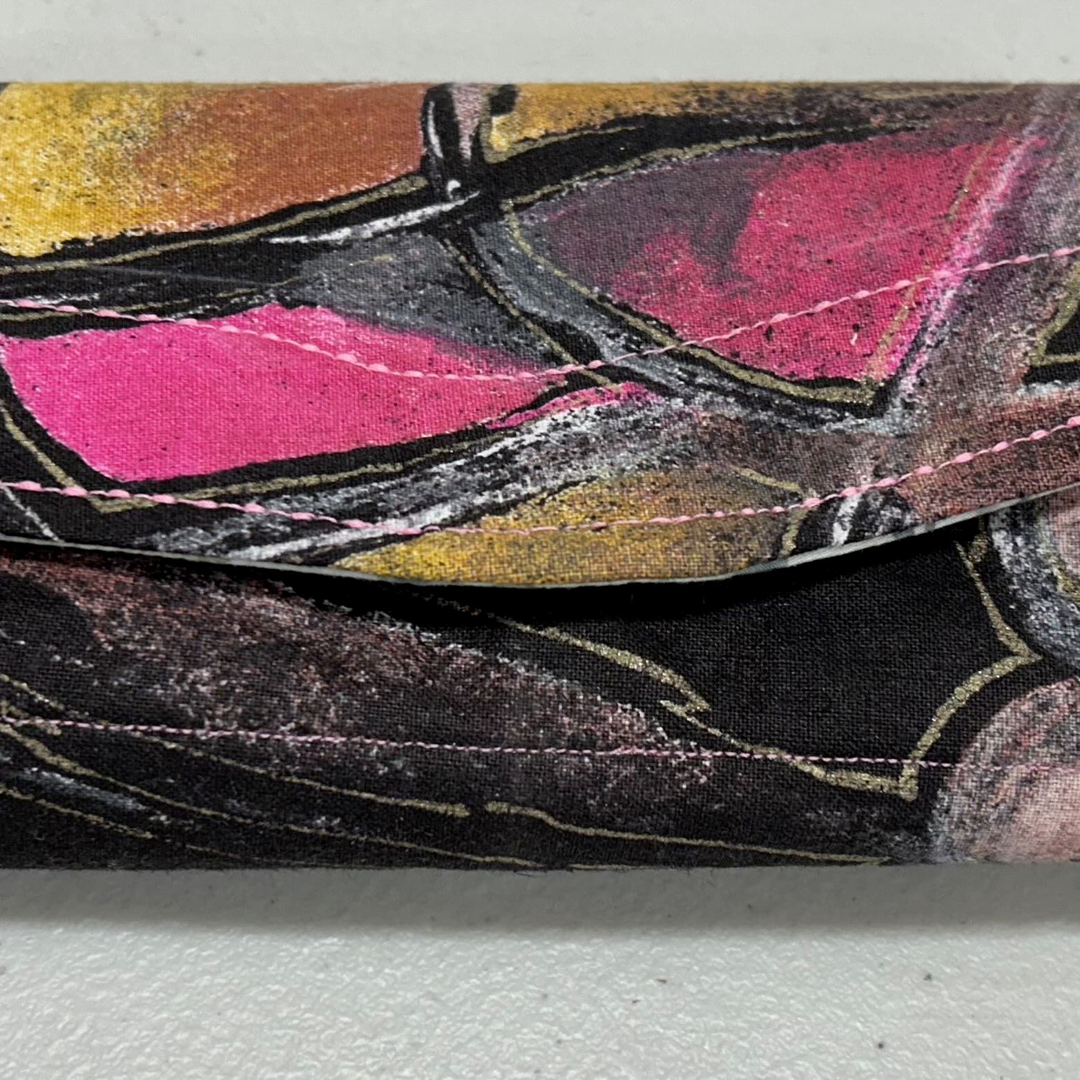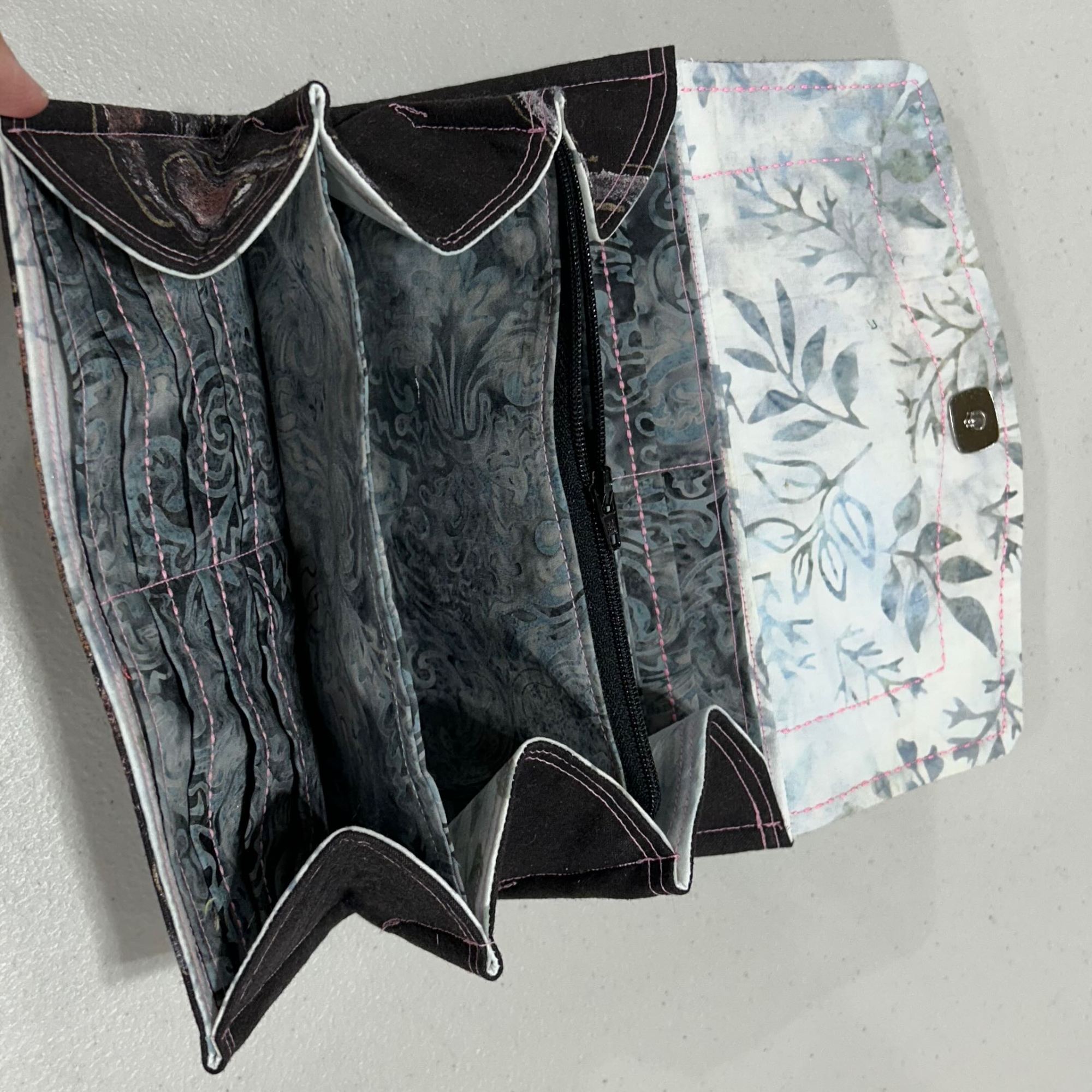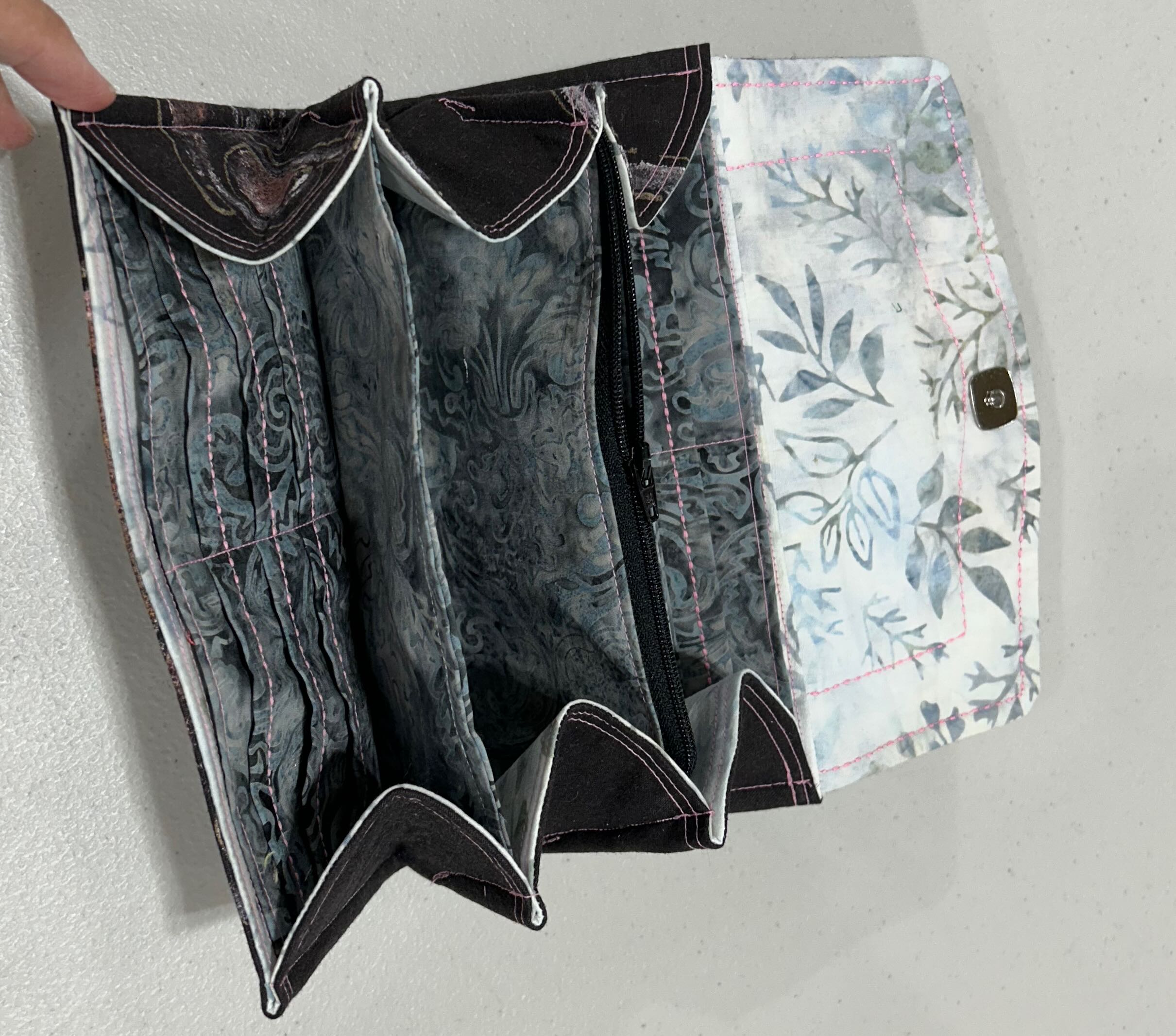 I did complete a secret top … but I’ll show you that when the time is right. I also managed to finish a wallet that I had started before when I was helping to teach a class. It’s the Necessary Clutch from Emmaline Bags. The outside of the wallet is from an upholstery sample that I’ve had for YEARS and the inside is batik fabric.