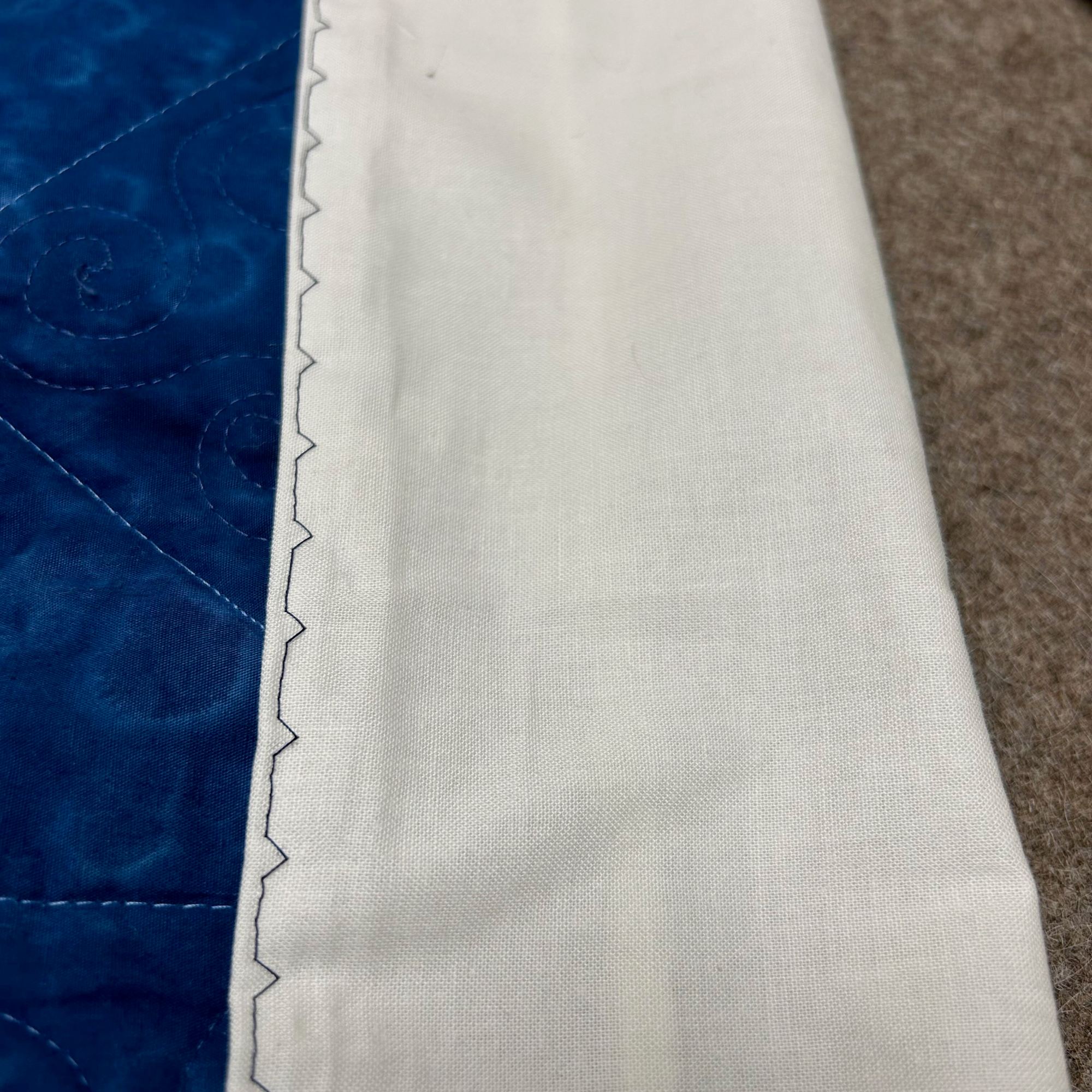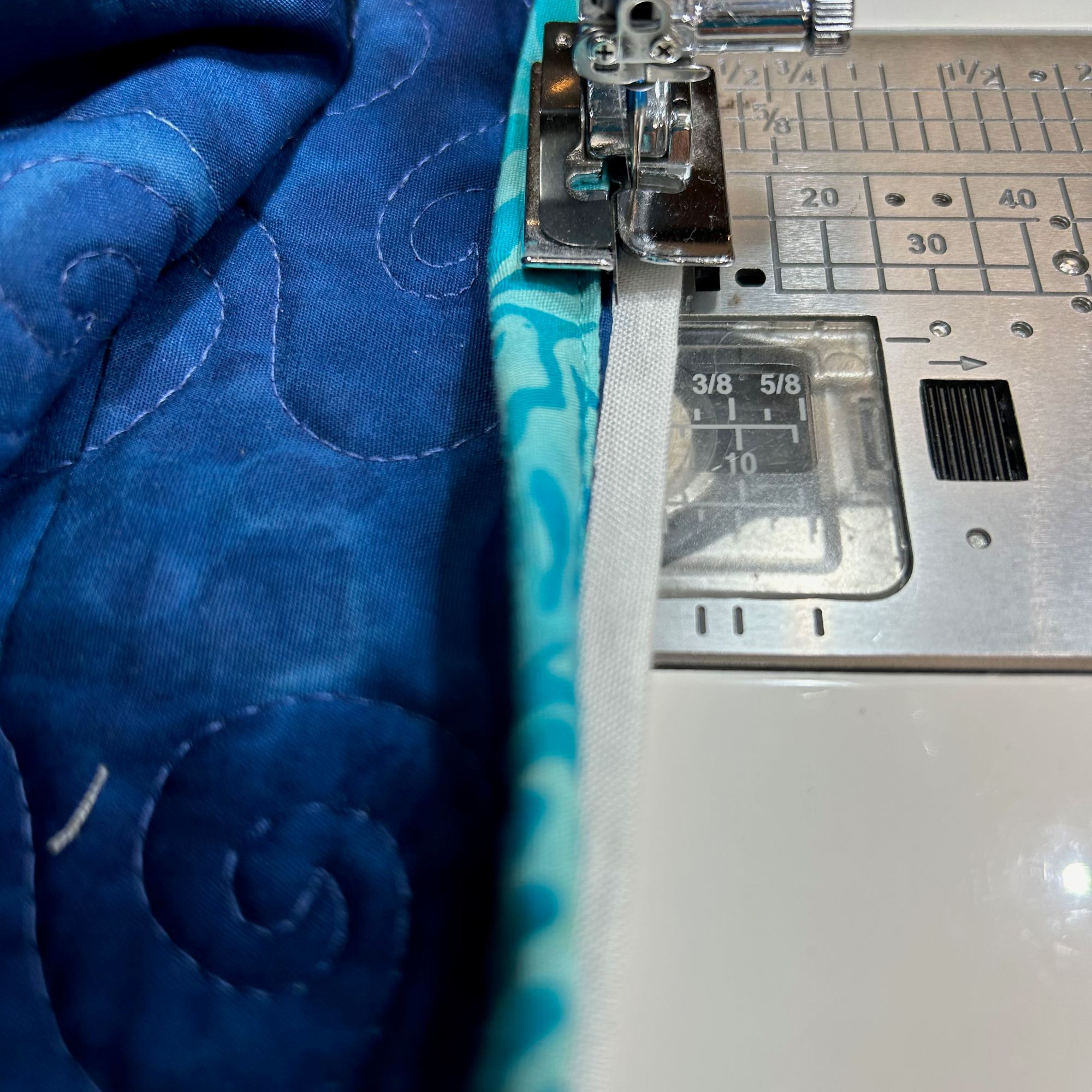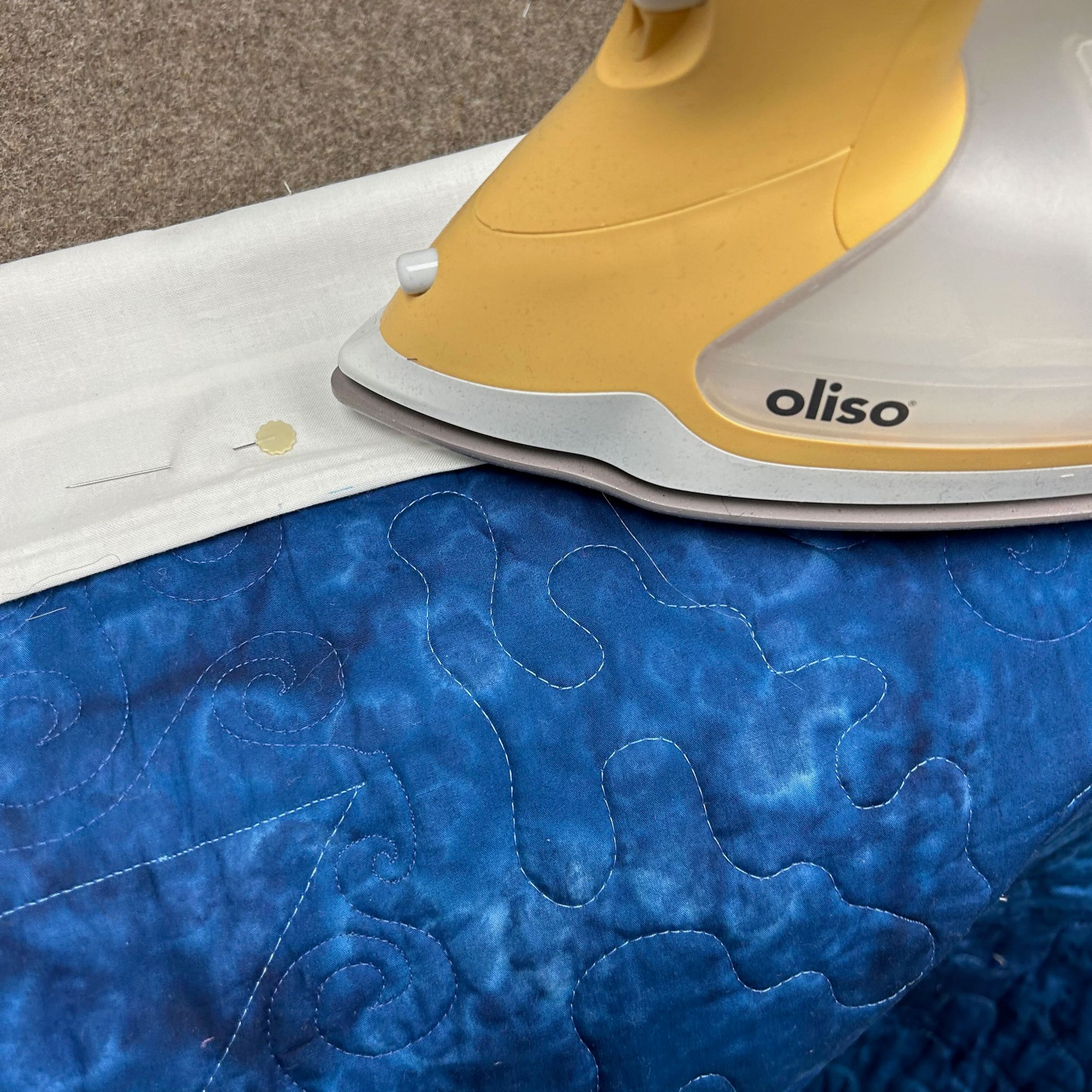 The following picture shows me using the Blind Hem stitch to add the hanging sleeve. For the 2nd or bottom row of stitching, I switched to the navy thread so it wouldn’t show on the front. My Oliso iron is awesome for pressing!!! (I received it as part of being an Island Batik Ambassador!)