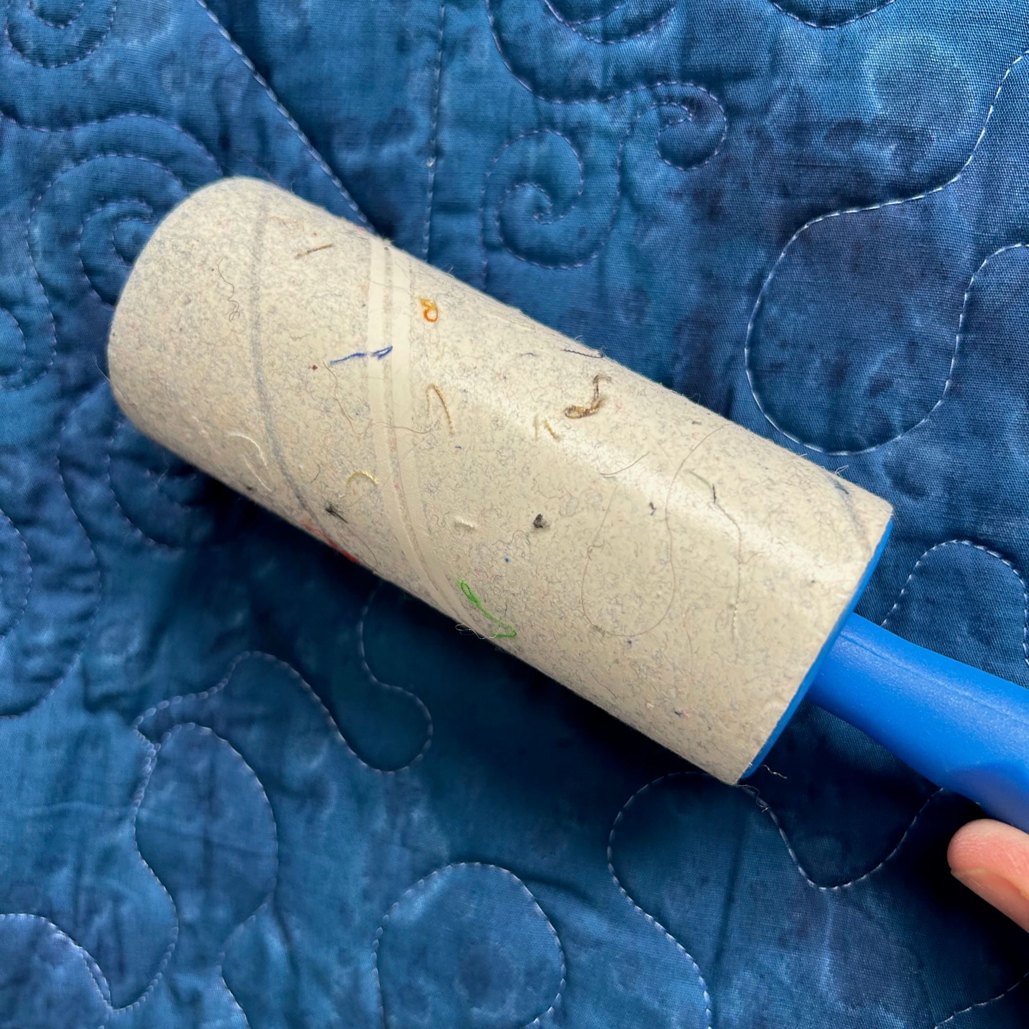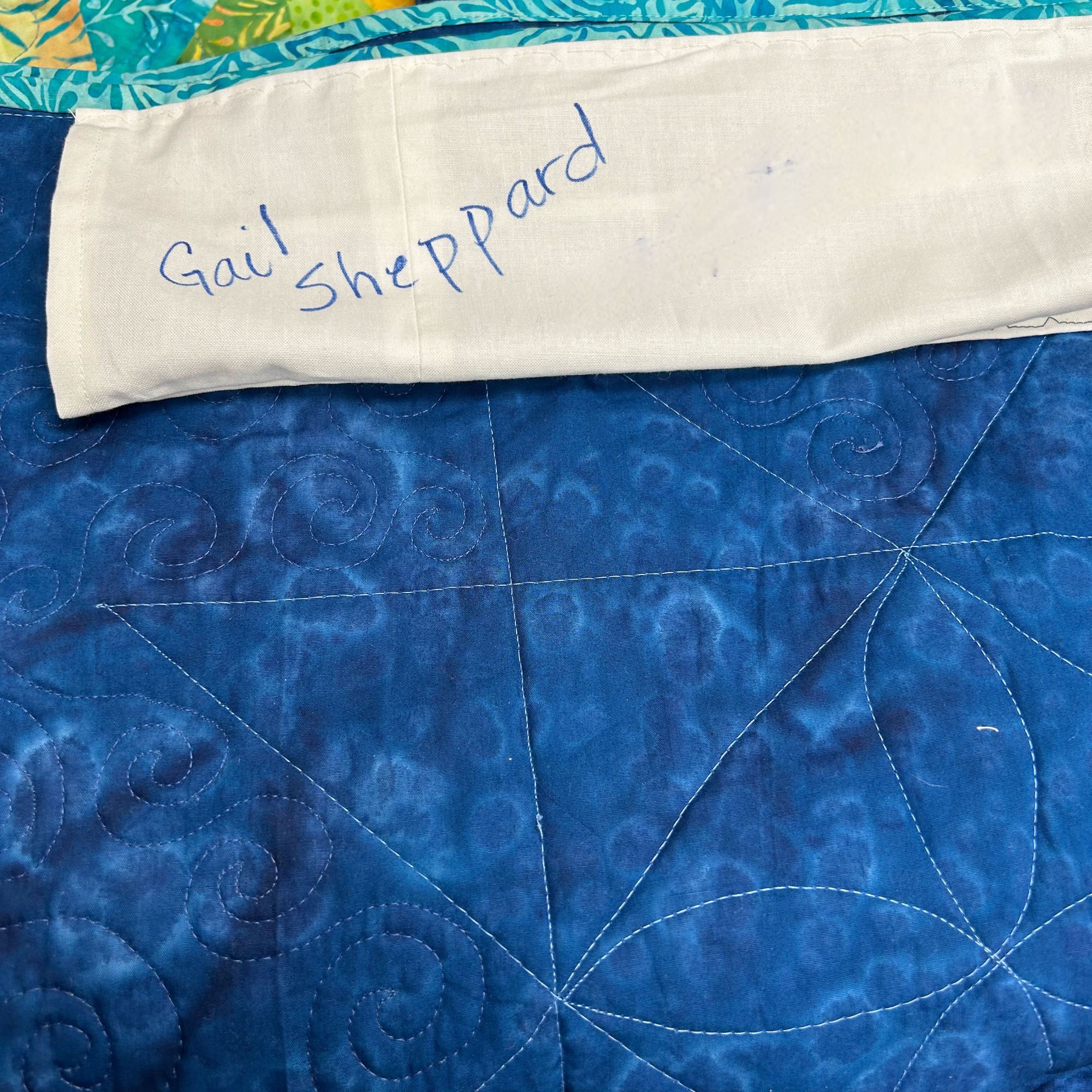 I used the lint roller to get all the excess lint off the quilt. We are to put a label with our names and phone numbers on the quilt. I’ve just written it on the hanging sleeve. A small piece of paper will have the name of the quilt attached, just below the sleeve.