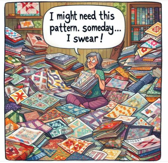 Is this you? I know it’s me. Our guild is having a quilt show next weekend and I should go through my quilting books and magazines and donate them … someone else might want a pattern that is in something.