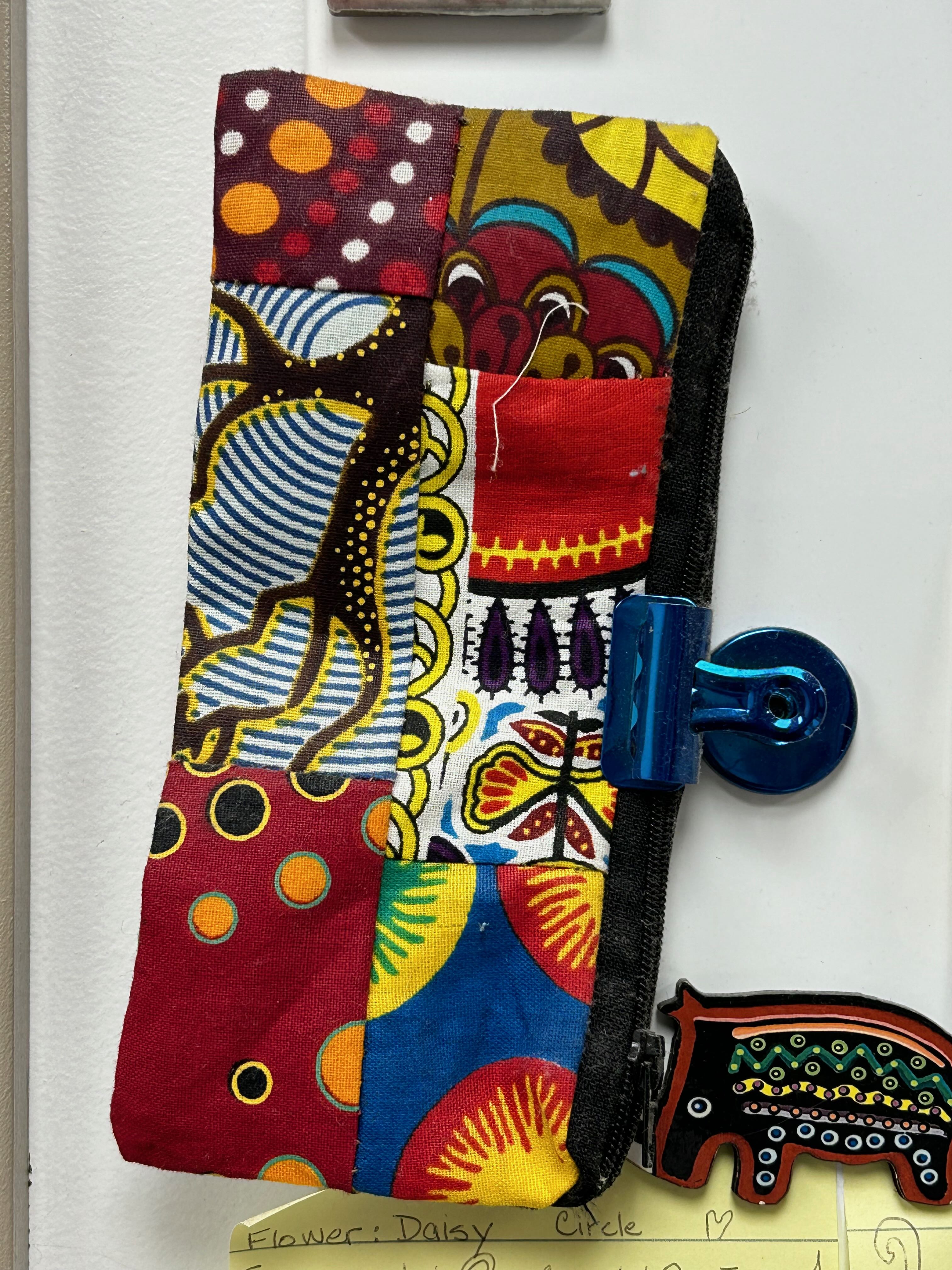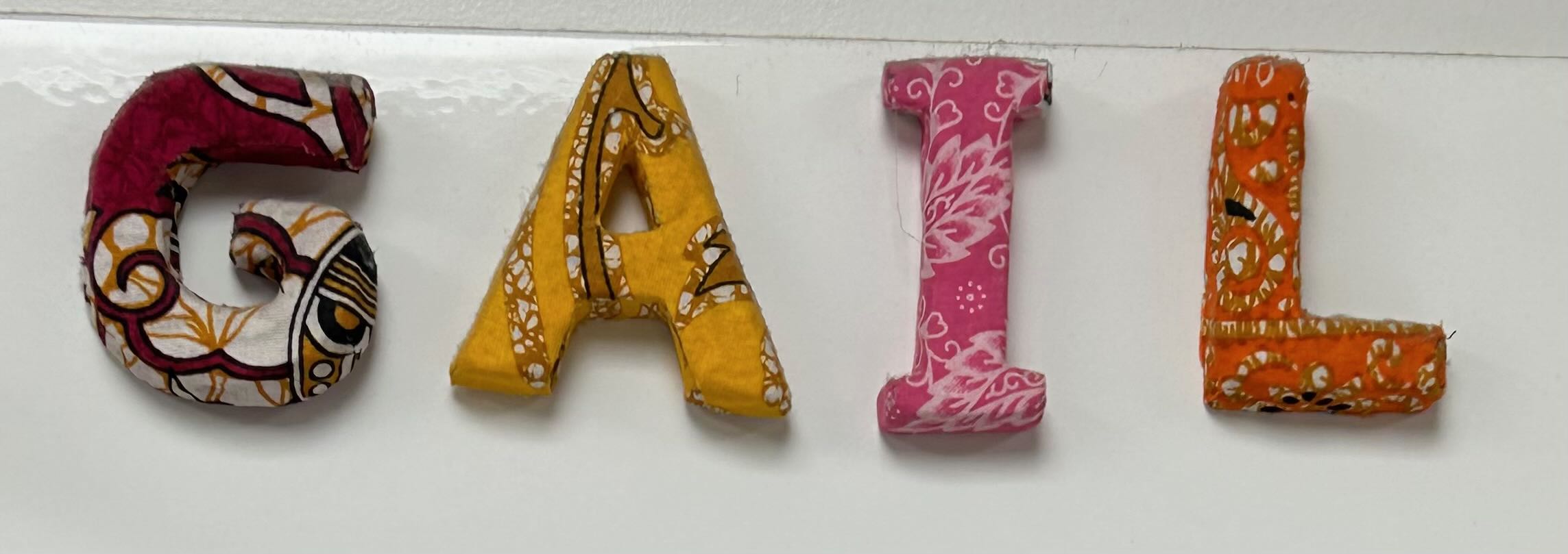The little zipper bag was bought at Victoria Falls in Africa and my daughter brought the fabric coloured magnetic letters when she returned from Cambodia.