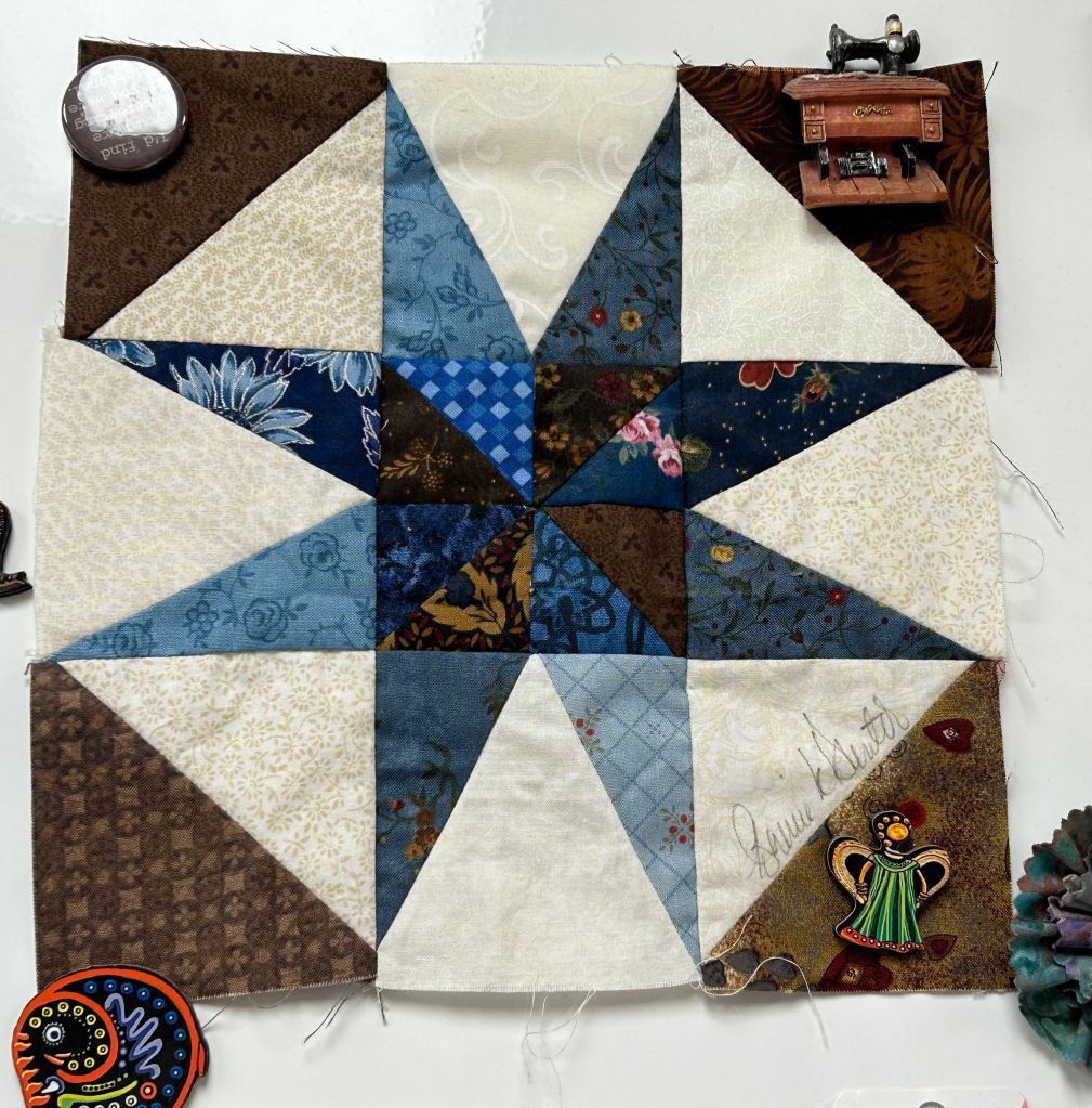 In 2015, I went to a retreat where Bonnie Hunter was teaching several classes. I took the Smith Mountain Morning class and I finished this block. Bonnie graciously signed it … and it is a real treasure!