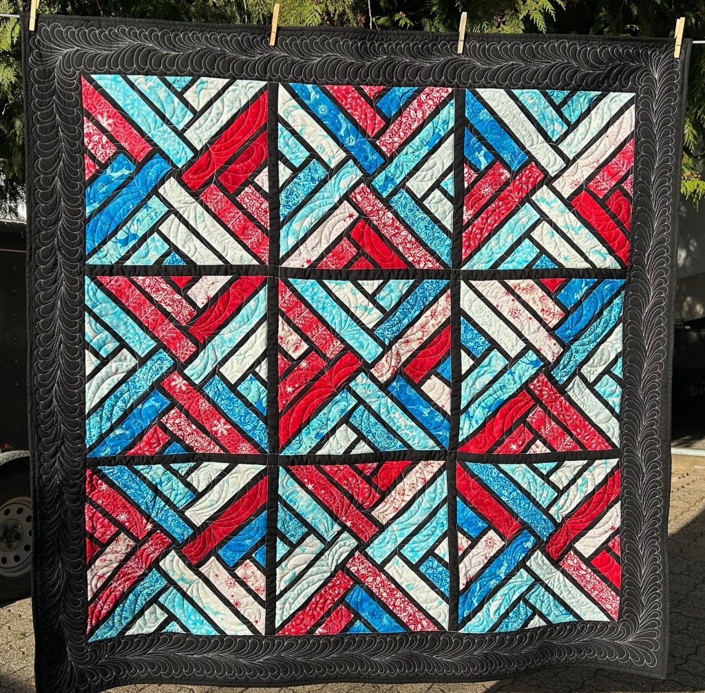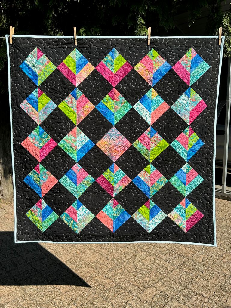 A former Island Batik ambassador (Claudia Porter) had a signature collection and asked if I wanted to participate in a blog hop. This is the quilt I made, using “Prisms.” You can read about it at THIS POST.