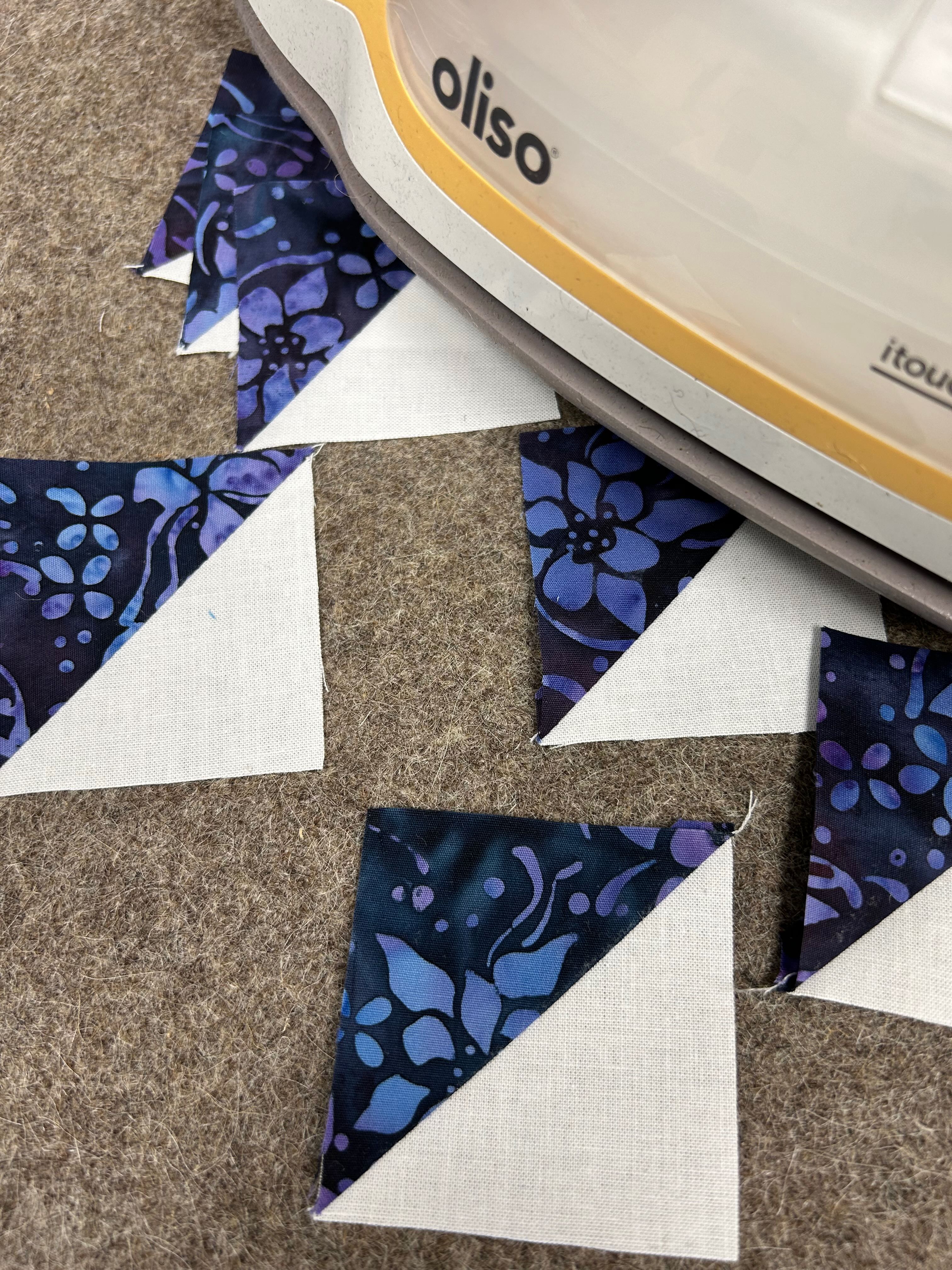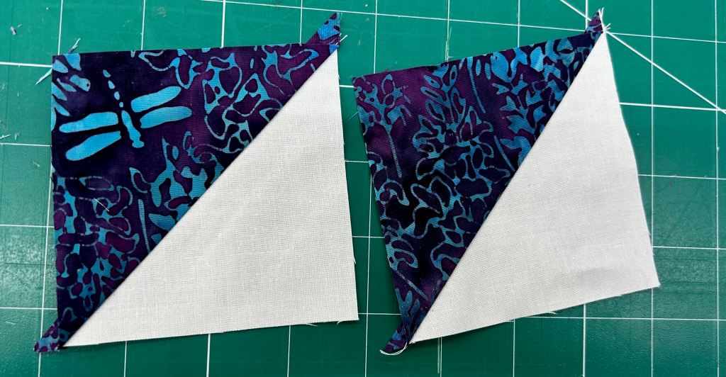 The Starflower block can be found HERE. I made the block exactly according to the directions. Here’s 2 of the Half-square triangles before trimming.
