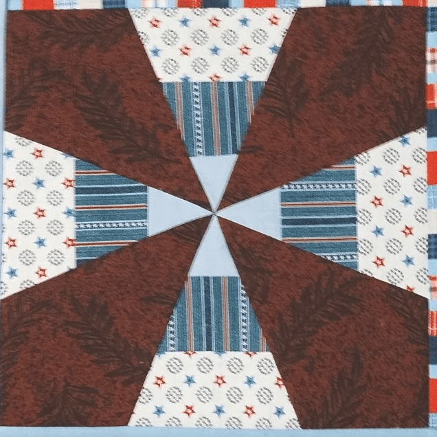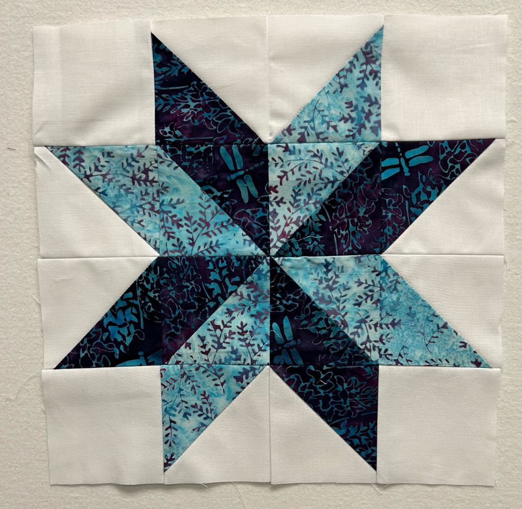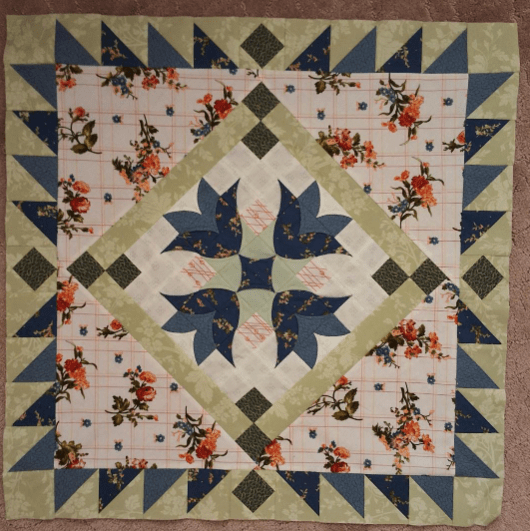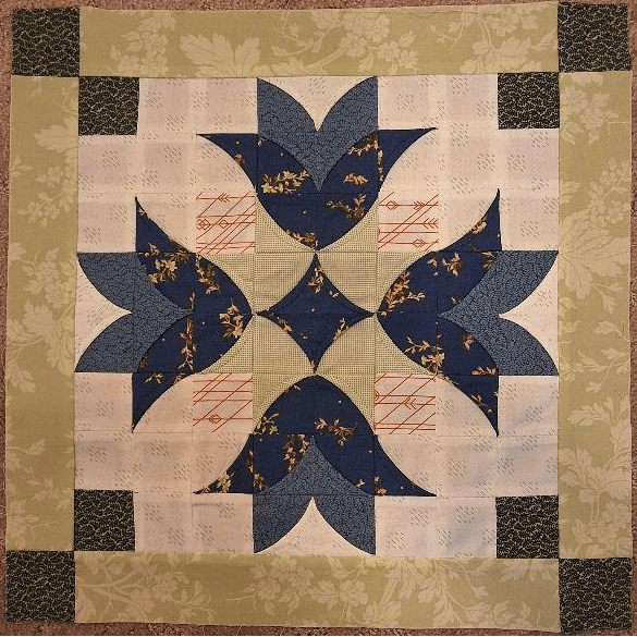 My block is the Starflower block. I found this block at The Quilter’s Cache: Quilt Blocks Galore. If you want to be overwhelmed by block choices, this is the place to go. There are blocks from 4″ to 24″ and several that you can make any size you desire! The lists of block patterns tell you the level difficulty and if they are paper pieced or have appliqué.