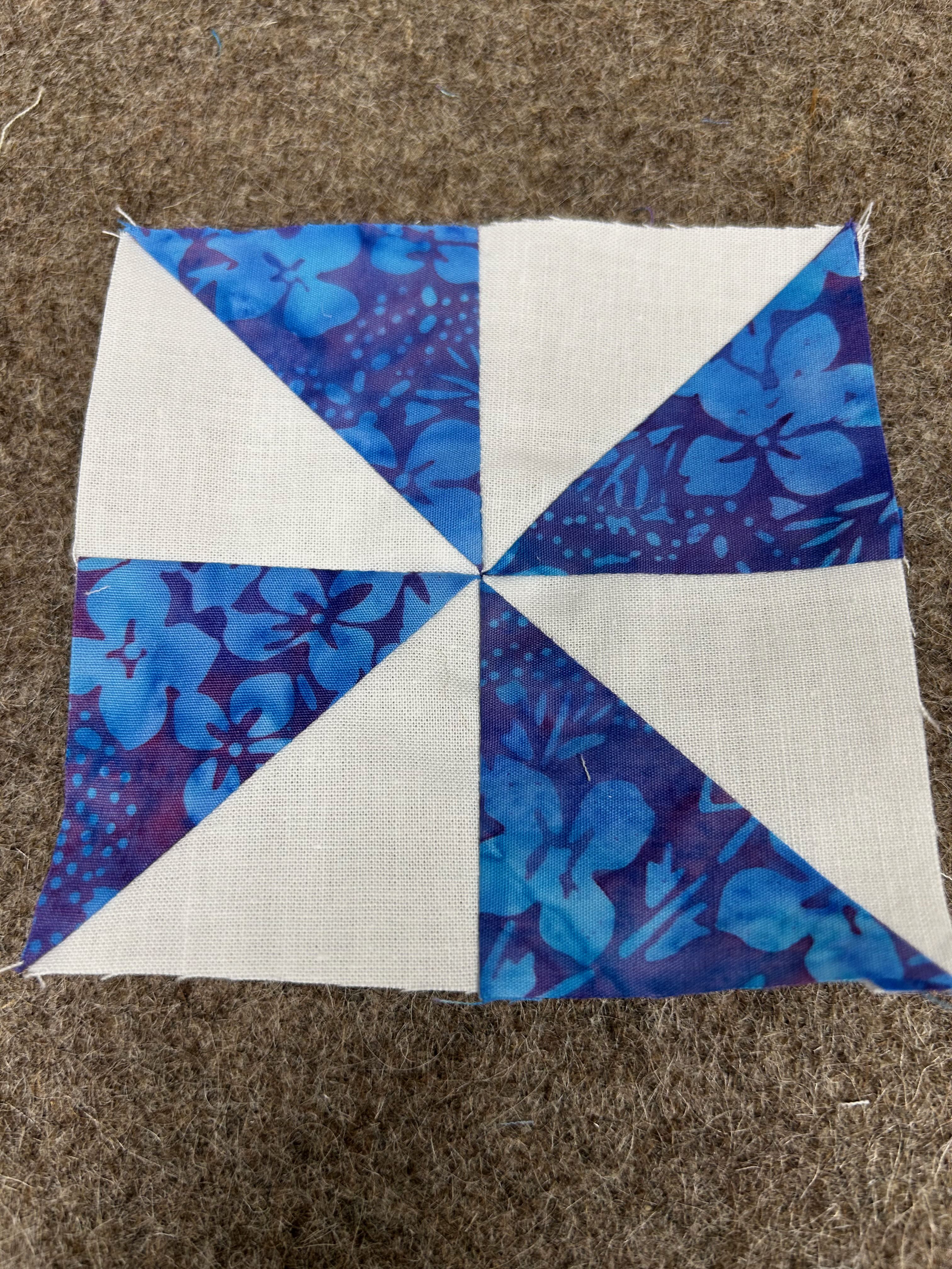 The prompt for this was Anja Quilts: Triangles. I love pinwheels, so this was the perfect time to make them! The half square blocks are 2 1/2” square (unfinished). I cut them in groups of 4, using an Accuquilt Qube 8 die. Then I sewed them together to make the pinwheels. Each pinwheel finishes at 4″ square.