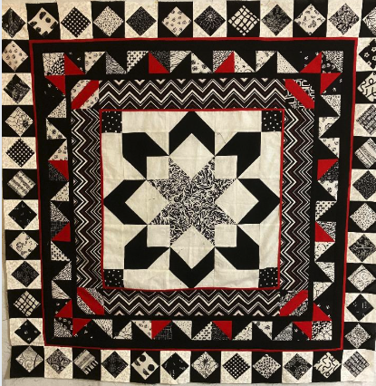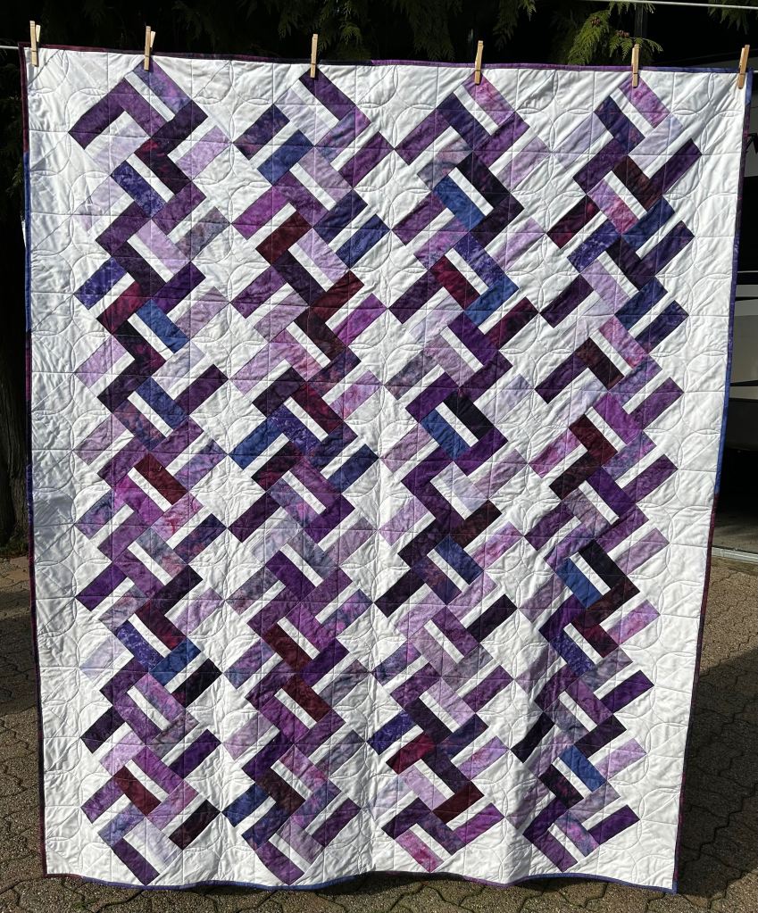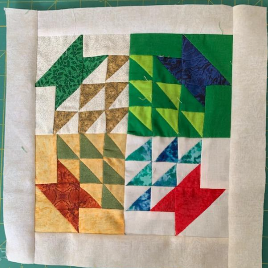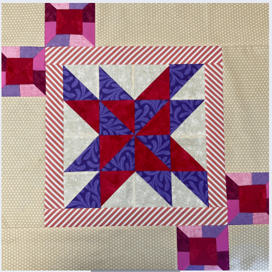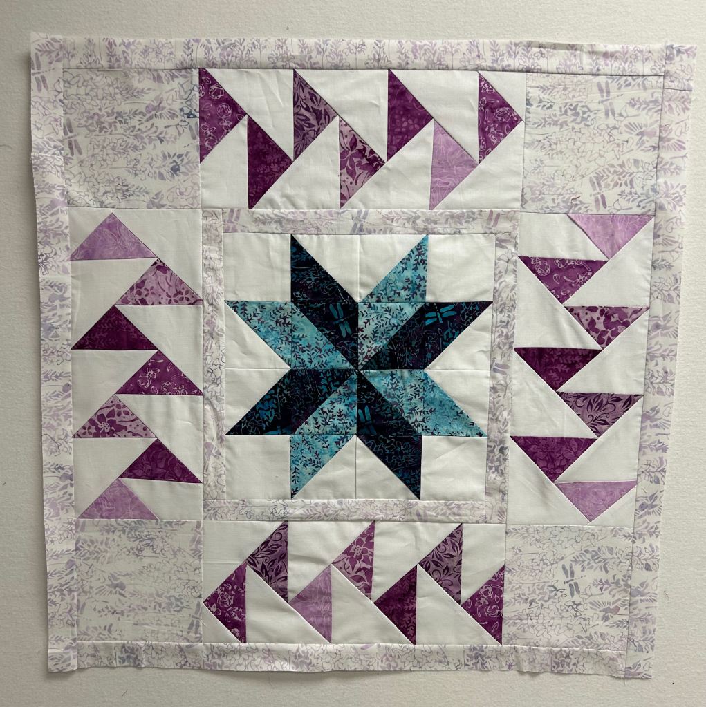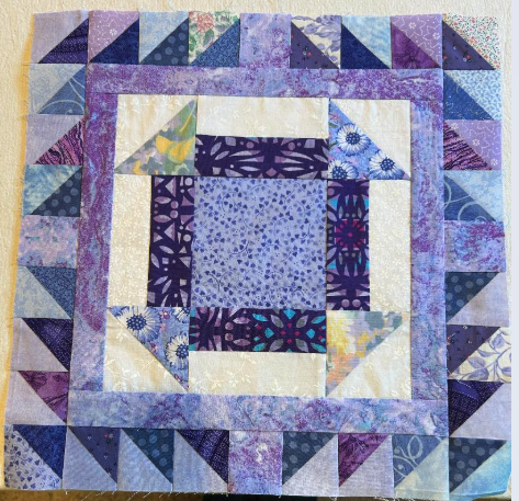Kristen has added blue & purple triangles all around her centre block. “S” is for Susan and Sawtooth border. Susan told Kristen that she needs more purple in her life, so this quilt is for her!