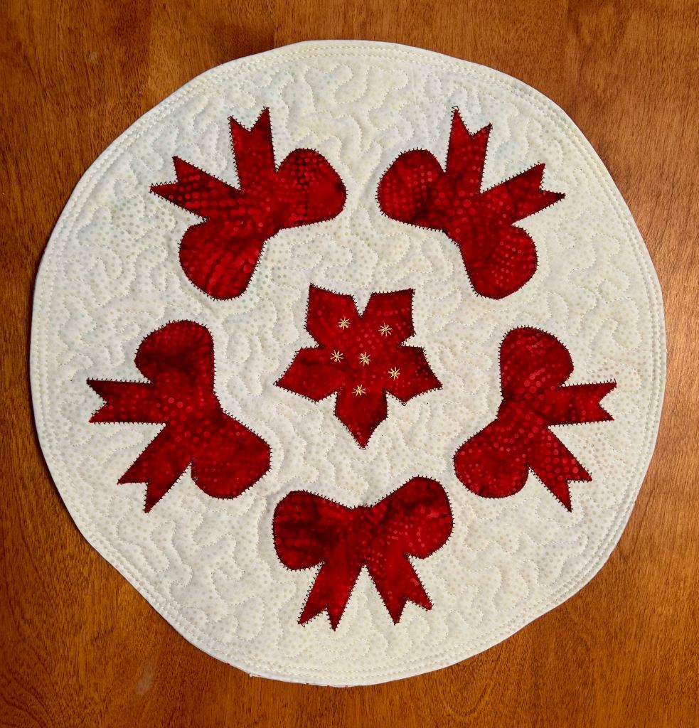 This table mat used various Island Batik fabrics, Hobbs batting and Aurifil thread. The bows and poinsettia were cut out using Templates from Missouri Star Quilt Company. You can see more details on THIS POST.