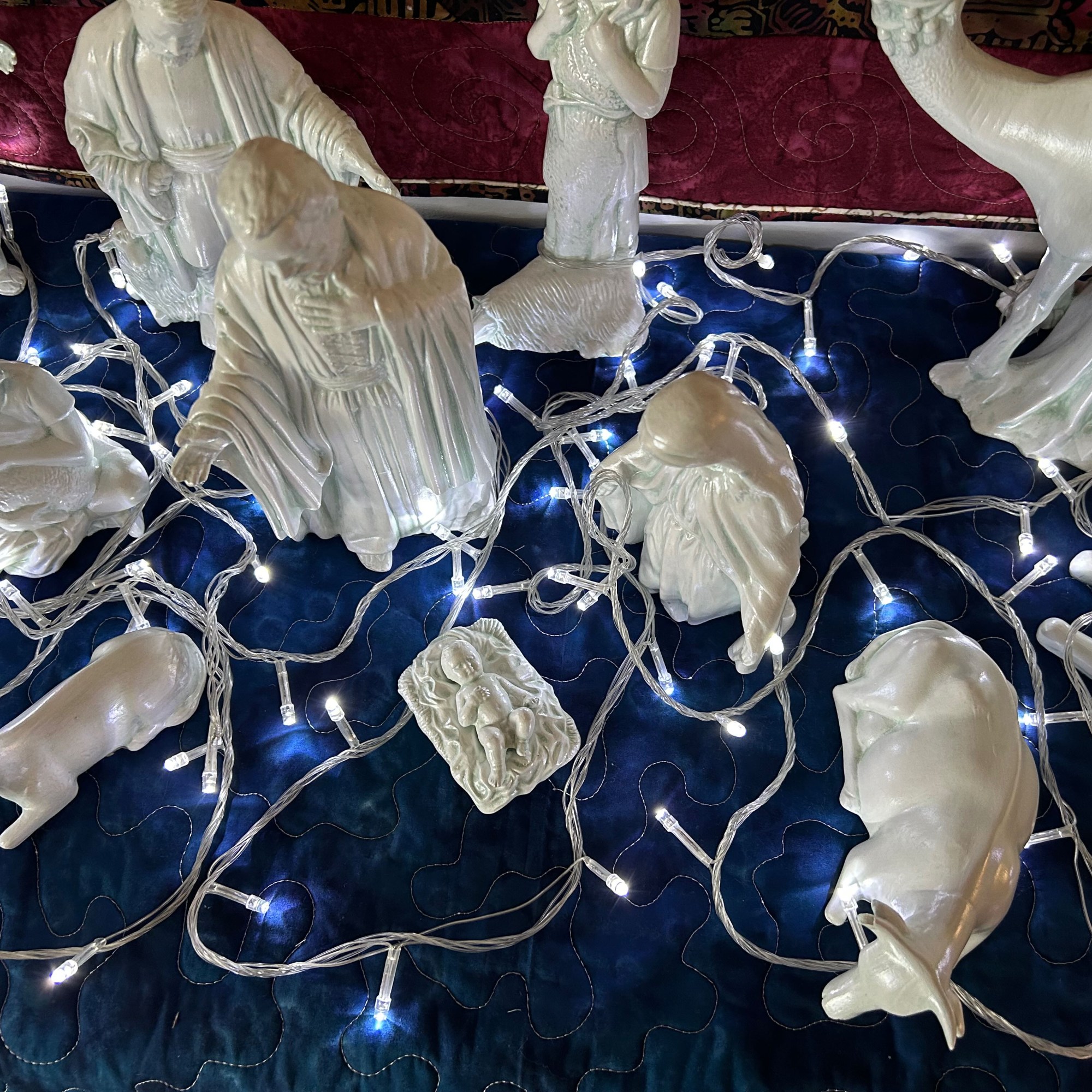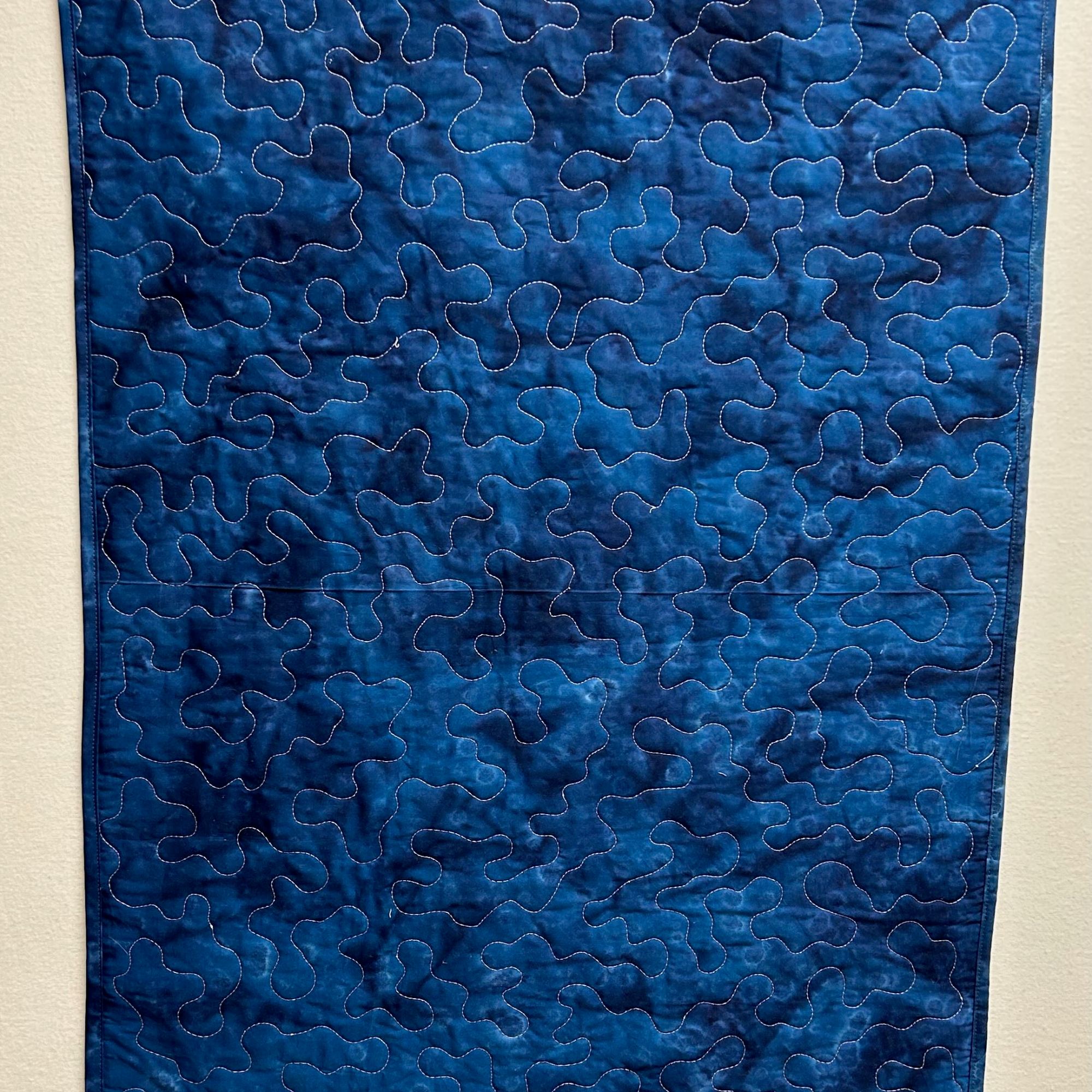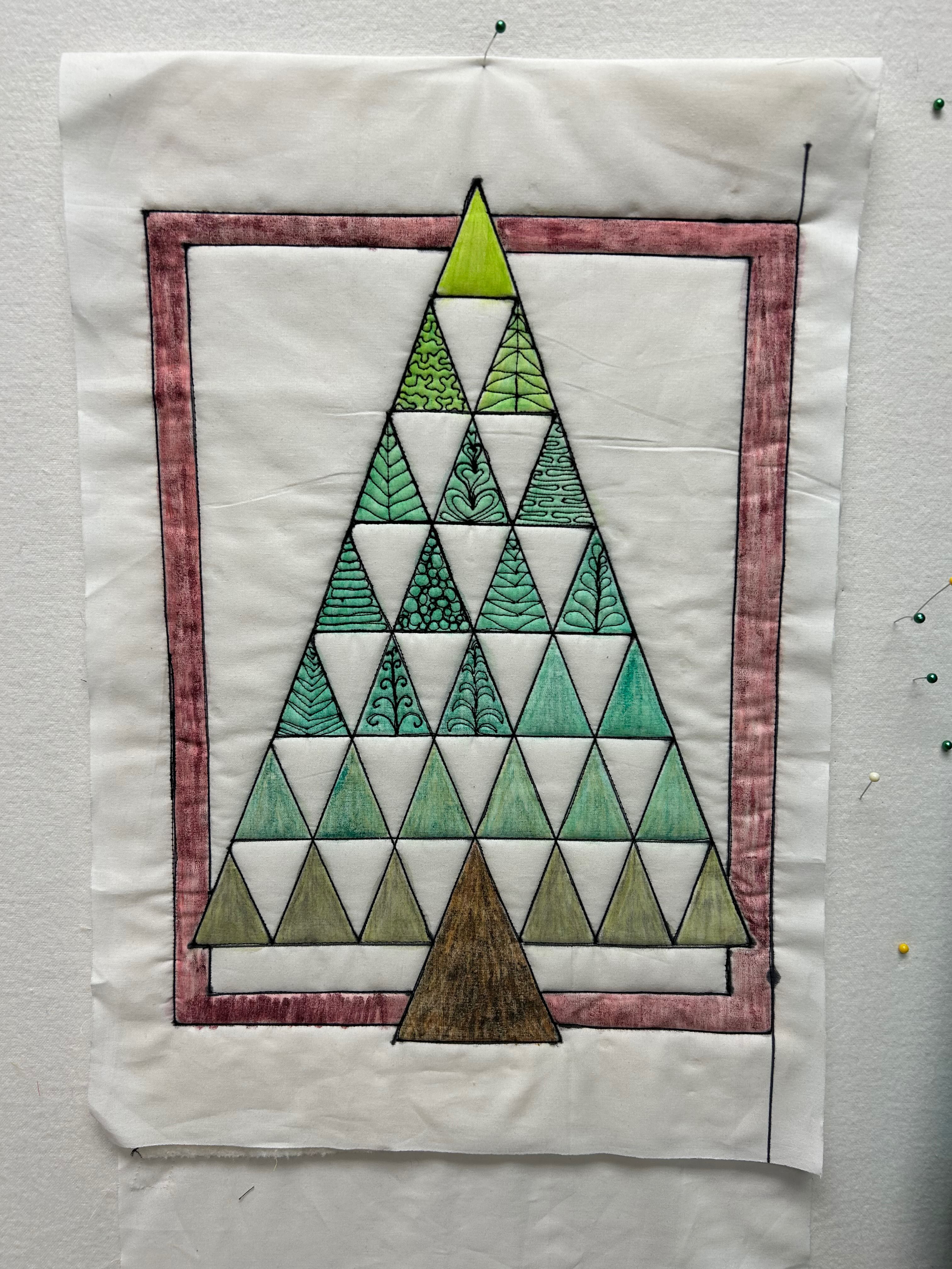 Helen Godden’s Christmas Countdown ’24 (my sister & I are doing this by zoom) Traced the pattern on to Island Batik’s solid white and started quilting with Aurifil Black thread. Hobbs 80/20 is in the middle.
