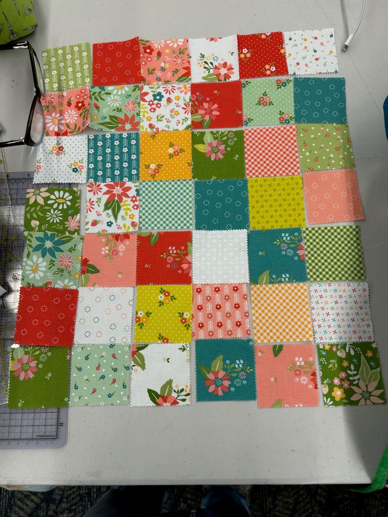 In September, when I was at a retreat at Loon Lake, I was given a little mini charm pack. I immediately arranged them and sewed them together as leaders and enders. It didn’t take long and I soon had a rectangle of cute little squares.