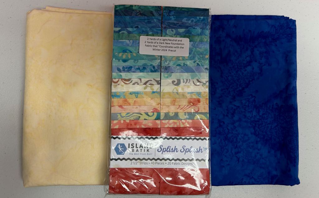 A 2 1/2″ Strip set of Splish Splash with 2 yard cuts of Oatmeal and Blueberry. Doesn’t it look like fun fabric to play with?