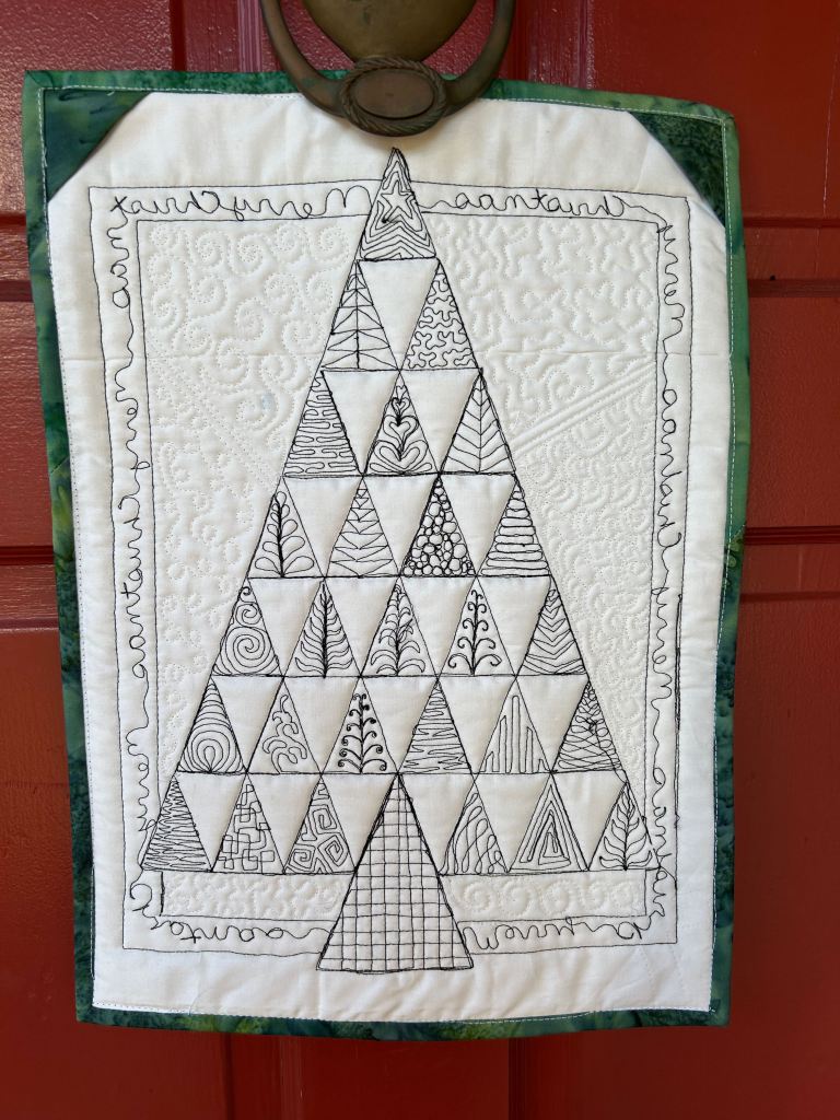 I worked on this Helen Godden topper while Zoom quilting with my sister (she did the same one at the same time!). The details of where you can get the pattern and instructions are on THIS POST. I used Island Batik’s solid white for the background, coloured it with Sharpie Stained markers and used a dark green for the binding.