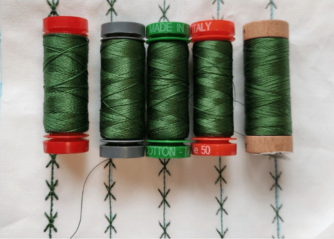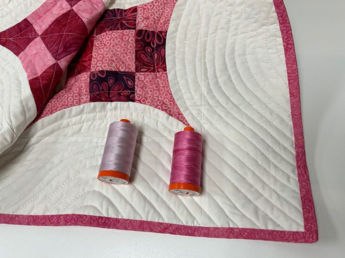 Karen Neary is a Canadian Aurifil seller. She is prompt and thorough with her products. It’s well worth visiting THIS POST to see some beautiful creations using Aurifil Thread. I was able to purchase some Monofiliment (invisible) thread from her! Karen recently posted this picture on Facebook to illustrate the various thread weights.