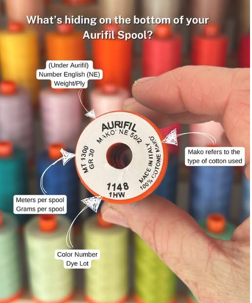 She also sent me this … which explains what the bottom (print side) or label on the Aurifil Thread spool is all about: