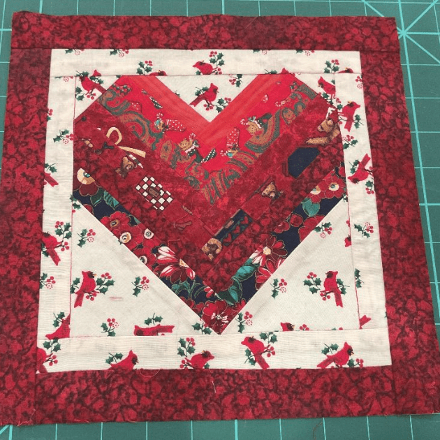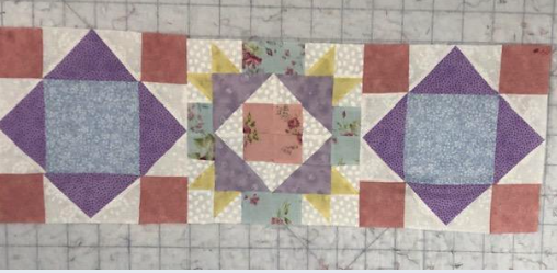 I did the migrating geese and trimmed the geese blocks to 6 1/4” x 13 3/4“. My centre block is 12 1/2” unfinished. I figured to fit the geese blocks onto my centre block, I need to add 1″ to each side. I cut 4 strips 1 1/2” wide and added them to the centre block. The corner stones are 6 1/4” x 6 1/4“.