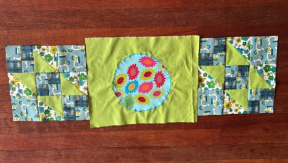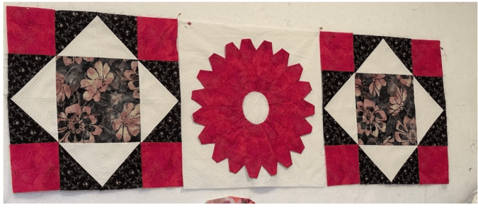 Judy has sent me a pic of her blocks. The blocks are 16″ square, so she’s decided to just go with 2 blocks.