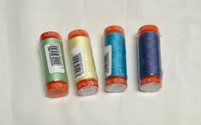 Do you see the 4 Aurifil Threads in the box? I got to choose which ones I wanted to use in the September Blog Hop. They were to coordinate or contrast with the Spring ’25 bundle that I received. These are the 4 threads that I choose:
