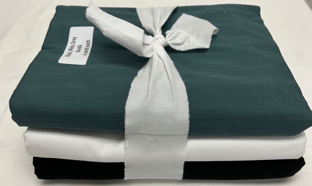 A Bundle of solids: 4 yards each of Dark Grey, White and Black