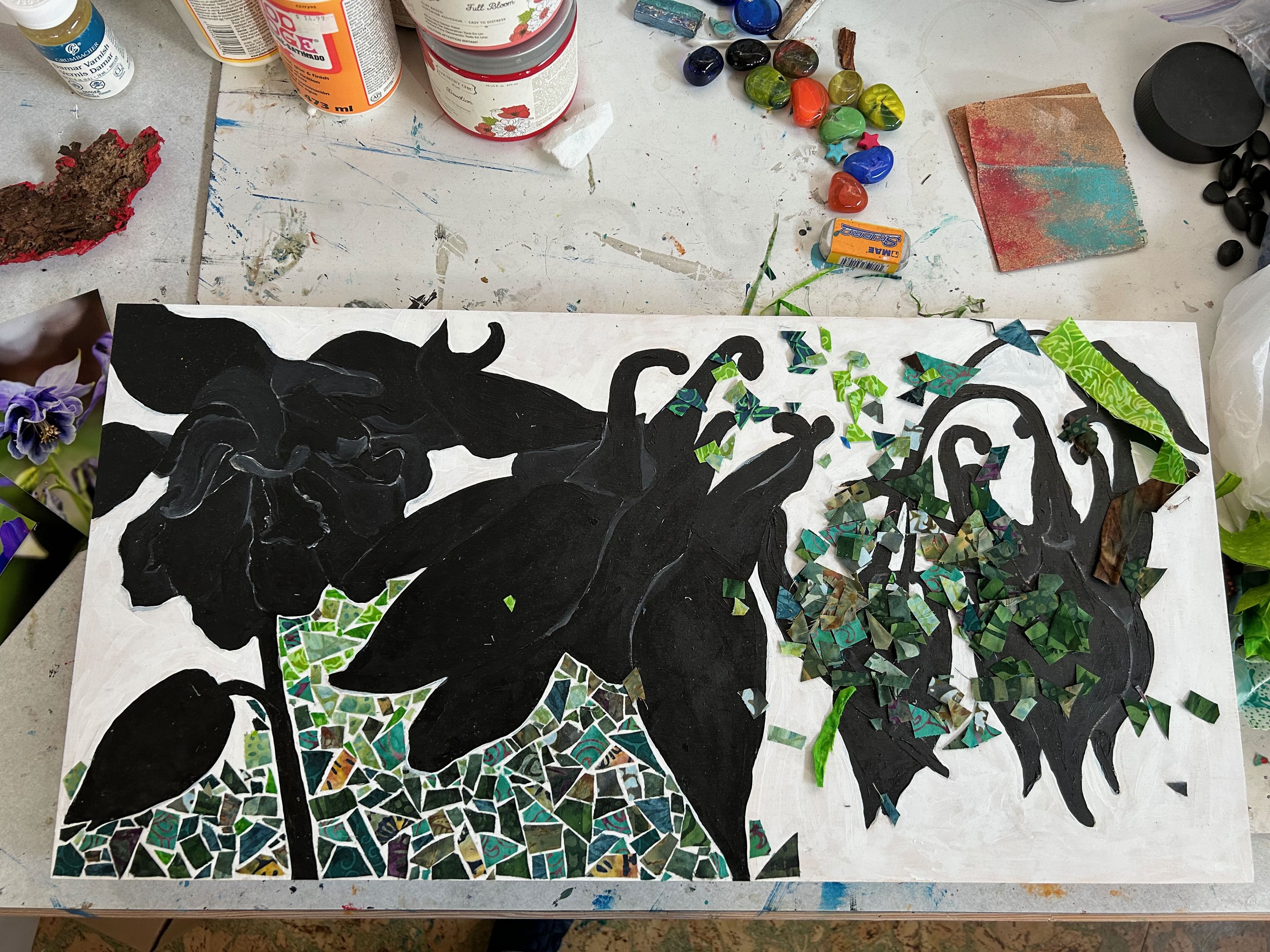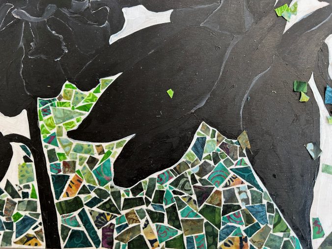 She painted white and black onto her board and used tweezers and glue to make the background (green) mosaic.