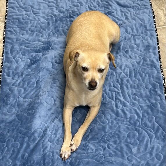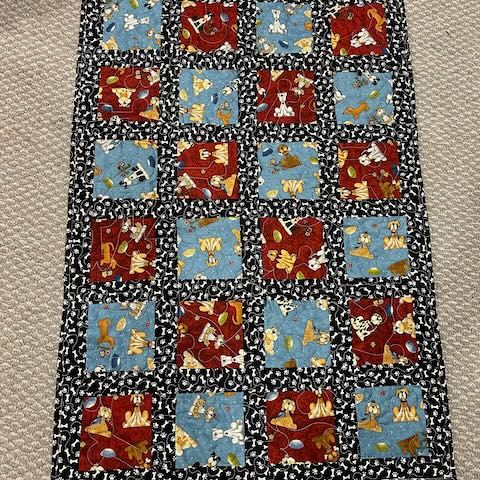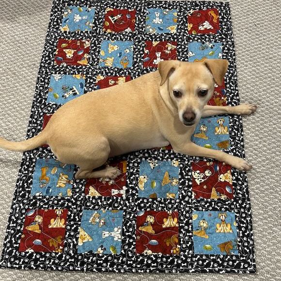 My husband has been bugging me to make a quilt for the grand-dog. I had made one a few years ago, but it went home with her mama. I decided to make one, using some dog fabric that I had left over. I kept it a secret and the grand-dog got it for Christmas. It’s 28″ x36″ and has a plush backing. Although it’s difficult to see, there are bones quilted all over it. You might be able to see them better on the backing!