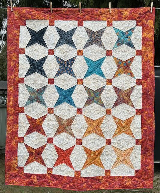 I used the “Kite” Accuquilt die and cut out a kite star from 20 of the 10″ squares, along with the coordinating pieces using Buttermilk. They were pieced together, then I added a 2.5″ sashing of Buttermilk and 2.5″ squares of Sea Urchins for cornerstones. This is the result: