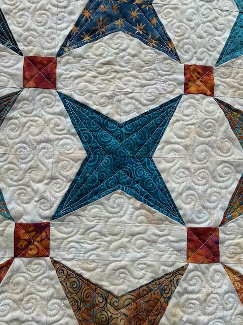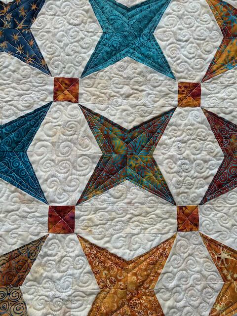 I used Silly Moon’s “Rocket” to outline the kite stars and do the inner stars. The neutral was free motion swirls. On the border, I used the “Kite” ruler to make the kites circulating the quilt.
