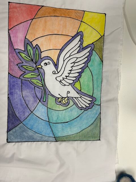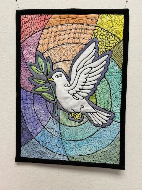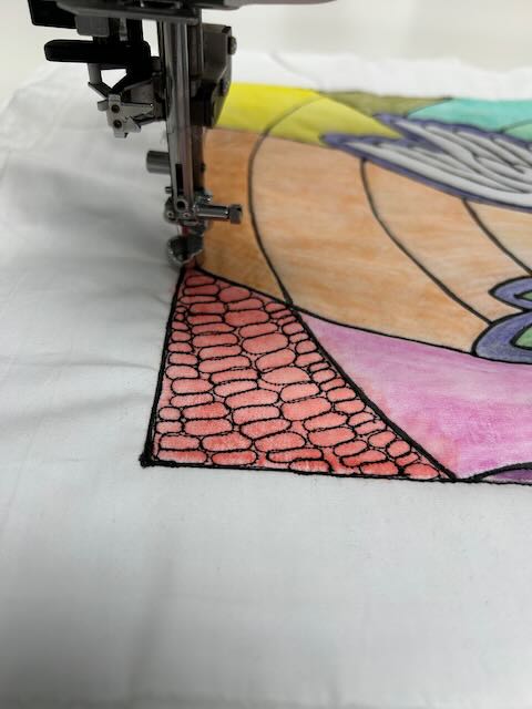 I used Island Batik (Lumin Fabrics) solid white fabric. The project was traced onto the fabric using a Sharpie “Stained” marker (doesn’t bleed like a regular sharpie). The lines were all stitched with Aurifil #2692 (black). The various sections were coloured with Inktense pencils and Aloe Vera. Hobbs 80/20 was used as the batting. All of the micro quilting was done with black Aurifil thread. The quilt was bound with Island Batik’s solid black fabric.