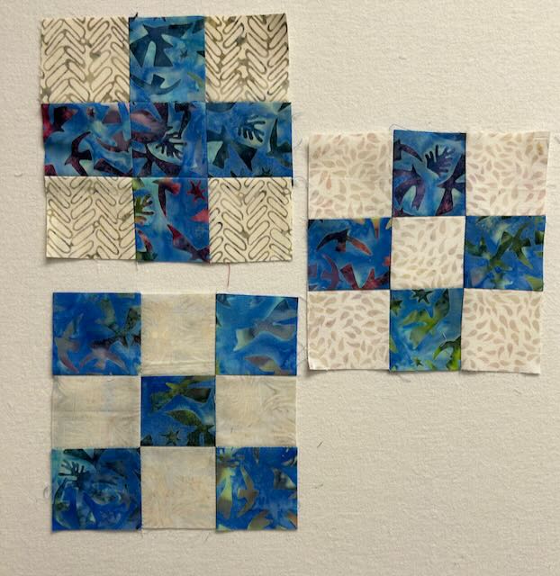 January’s colour is BLUE. Usually with blue, I would make at least a baby quilt, but I just made 3 nine patch blocks. The Island Batik 2.5″ squares were in my stash, no cutting involved! Just 3 different ways to do 9 patches with blues and a neutral.