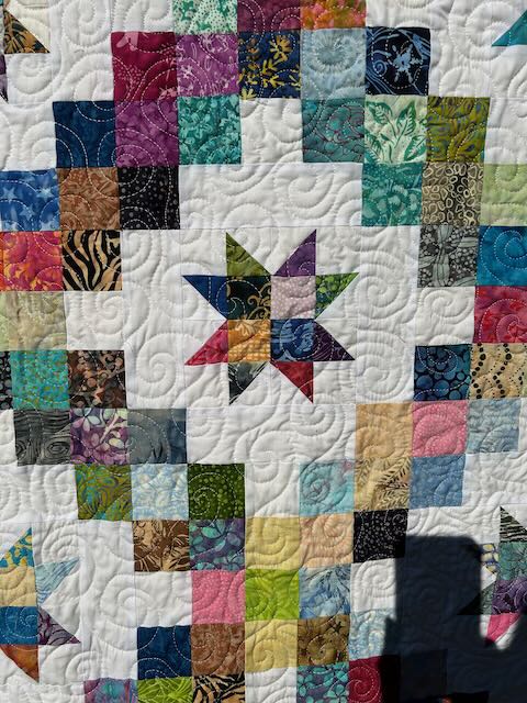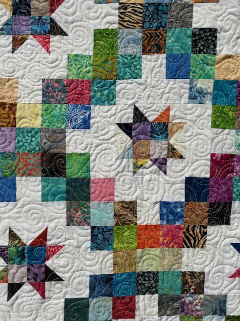 Well, with a destination in mind, it became my focus: piecing, quilting and scrappy binding. No pattern is available at the present time, but I’m willing to teach it in person or by zoom.