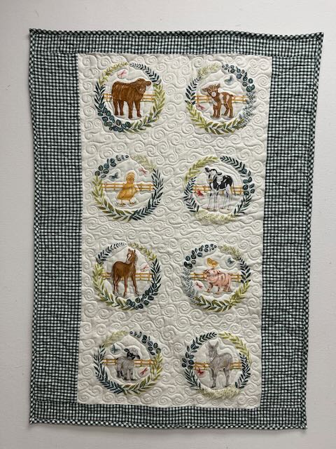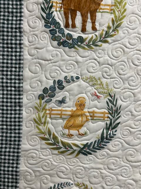 The panel is “Willow’s Farm” and the borders are “Organic Gingham.” This baby quilt was backed with a fabric called “Teddy Plush” in beige. It’s 100% polyester and I wasn’t sure how it would quilt. It quilted like a dream!!! The quilt slid under my foot with ease. The binding was cut on the bias, using left-overs from the borders. If you go into Essem, I’m sure Simina will make up a kit for you!