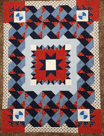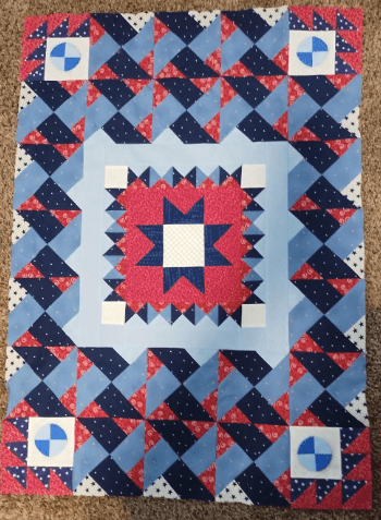 Rosie said, “I cut red, white and blue 2″ strips for a spacer border all around the quilt. I decided to wait to address my size adjustments in the next round.”