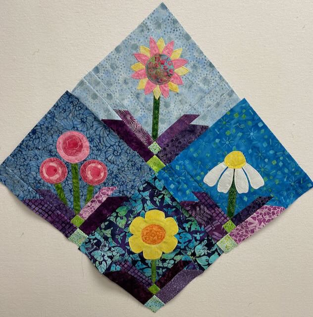 This is a Sew-a-long by Red Boot Quilt Company. Here are the first 4 blocks. Using scraps of Island Batik (Lumin Fabrics). Each of the flowers have trapunto and the applique is adhered with a small zig-zag stitch.
