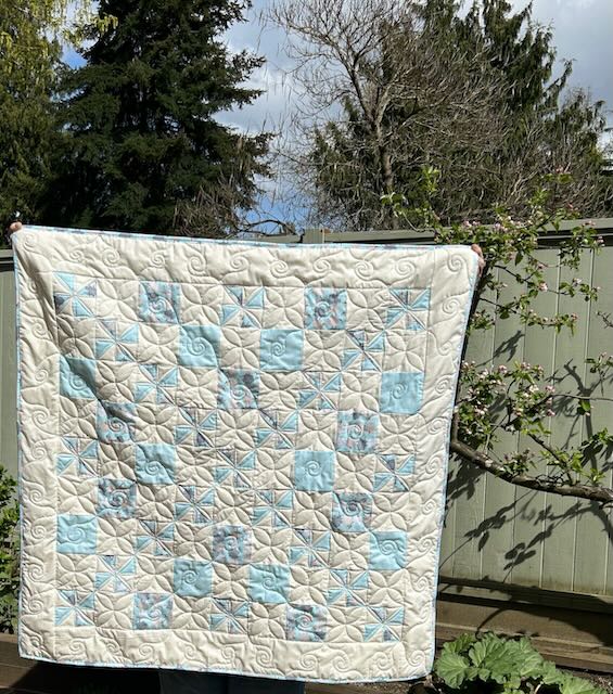 This quilt used left-over bonus half-square triangles from the Tilt-a-Whirl pattern, plus a bunch of 4 1/2″ squares. I absolutely LOVE 🩵 the apple blossoms that are starting to show!