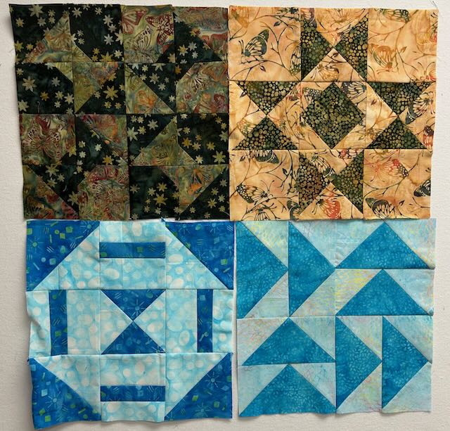 And here are the first 4 blocks together on the design wall. Yes, it’s way too busy … what should I use for sashing?