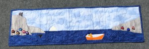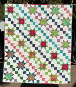 The white set off the beautiful fabrics from the collection. I was happy! I used Hobbs 80/20 batting and quilted it with Silly Moon “Rocket” to make the straight lines. It is bound with a scrappy binding with left-over pieces. It is 44″ x 52.”