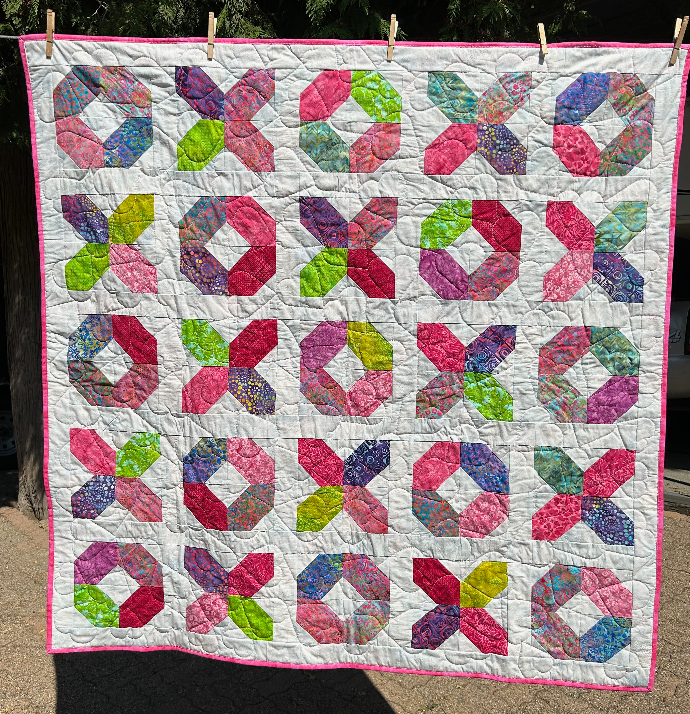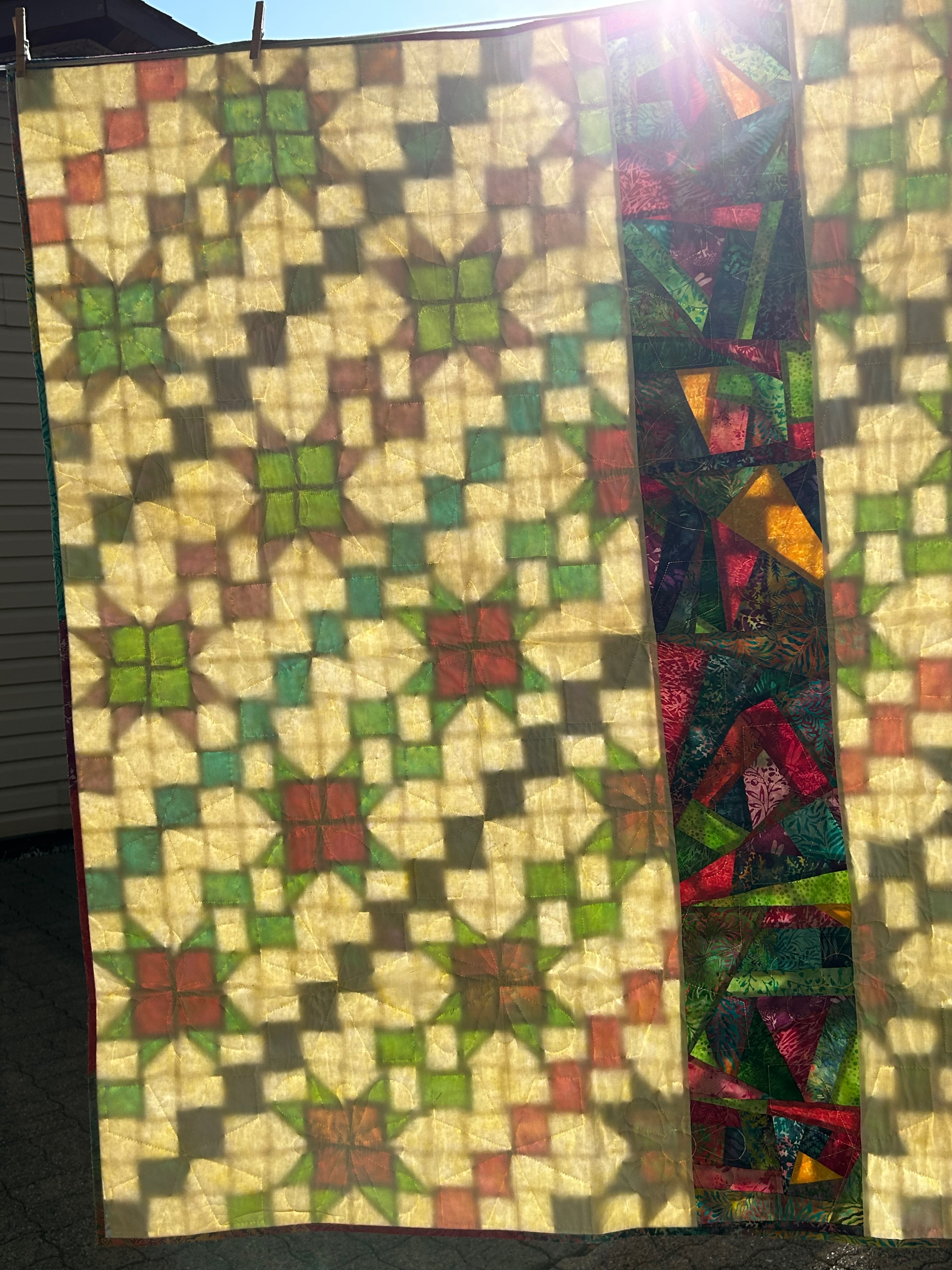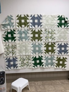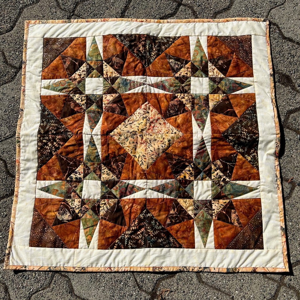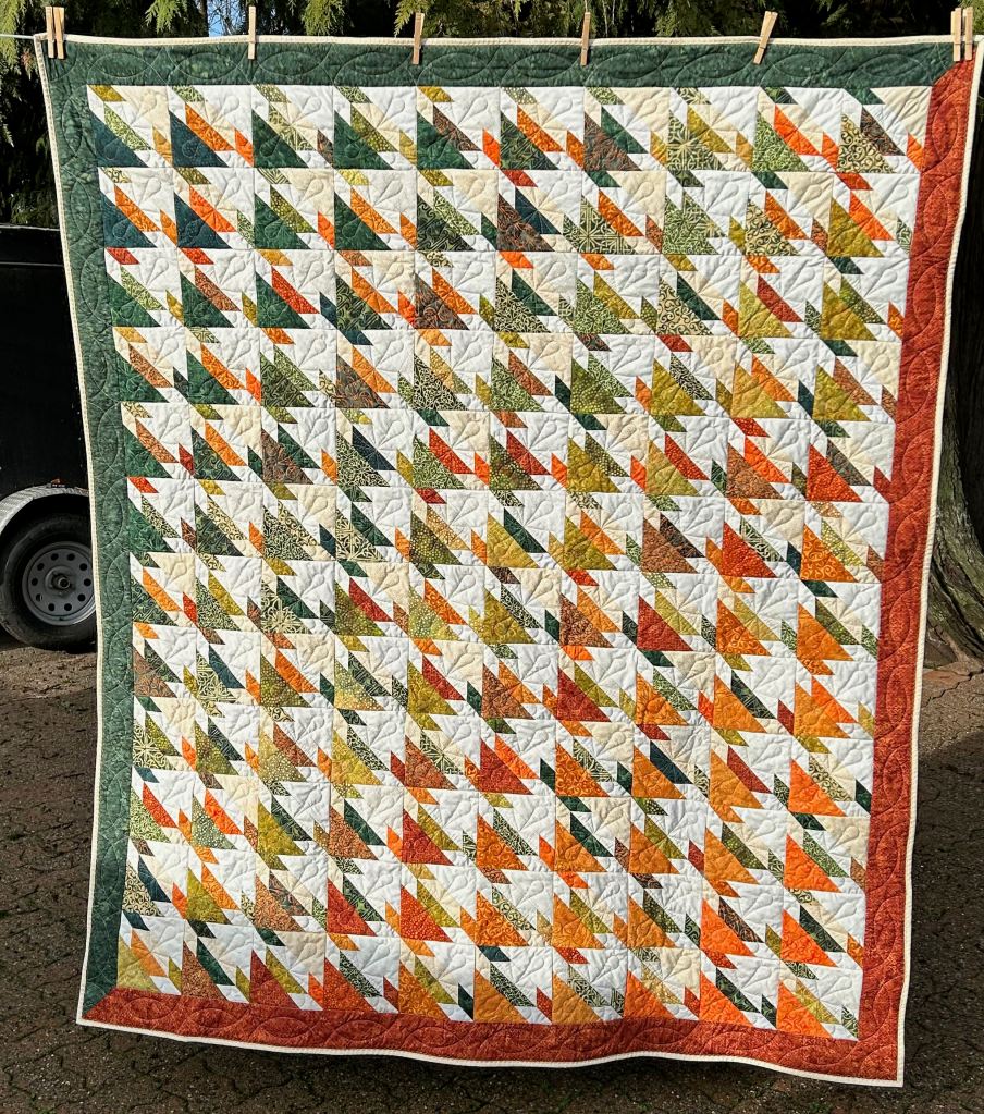 Well, no! It was too busy … and I hated it. And I didn’t take any pictures of the not-so-nice blocks. So I cut more triangle blocks out of white fabric and came up with this quilt: