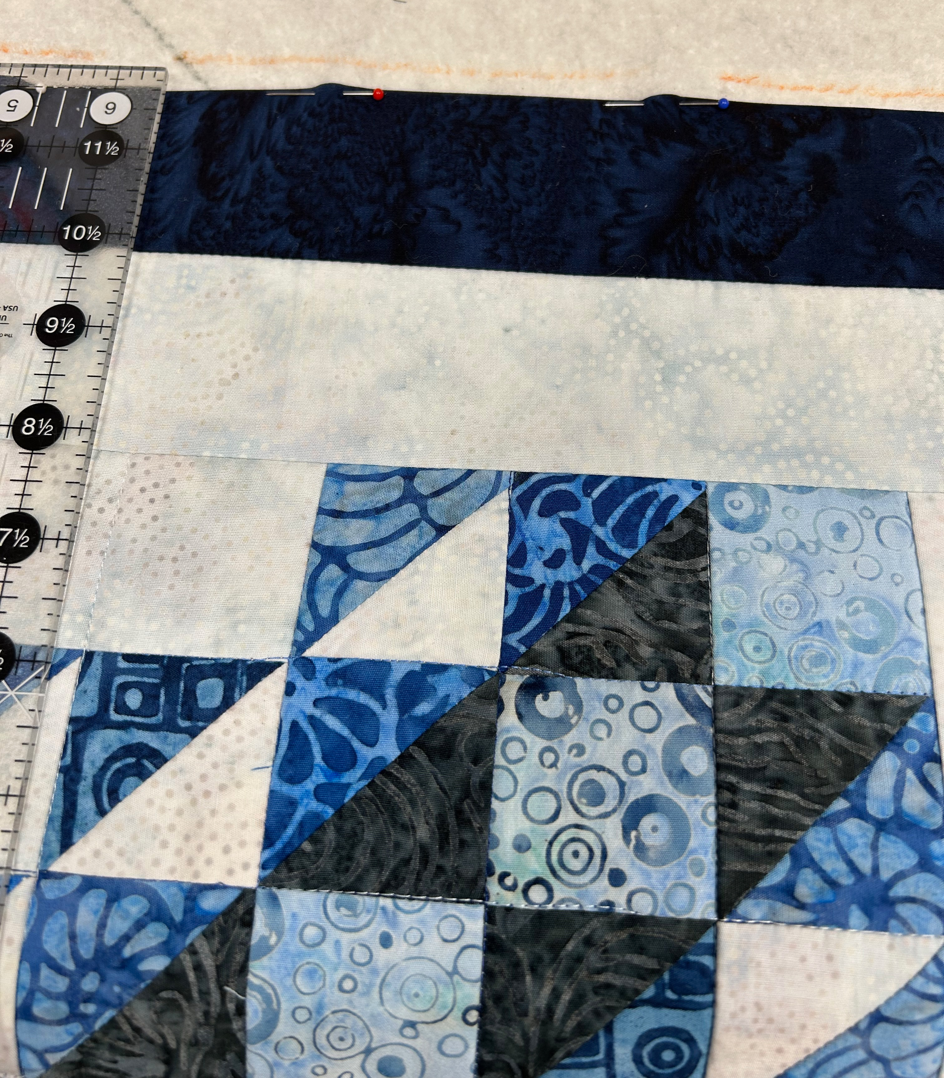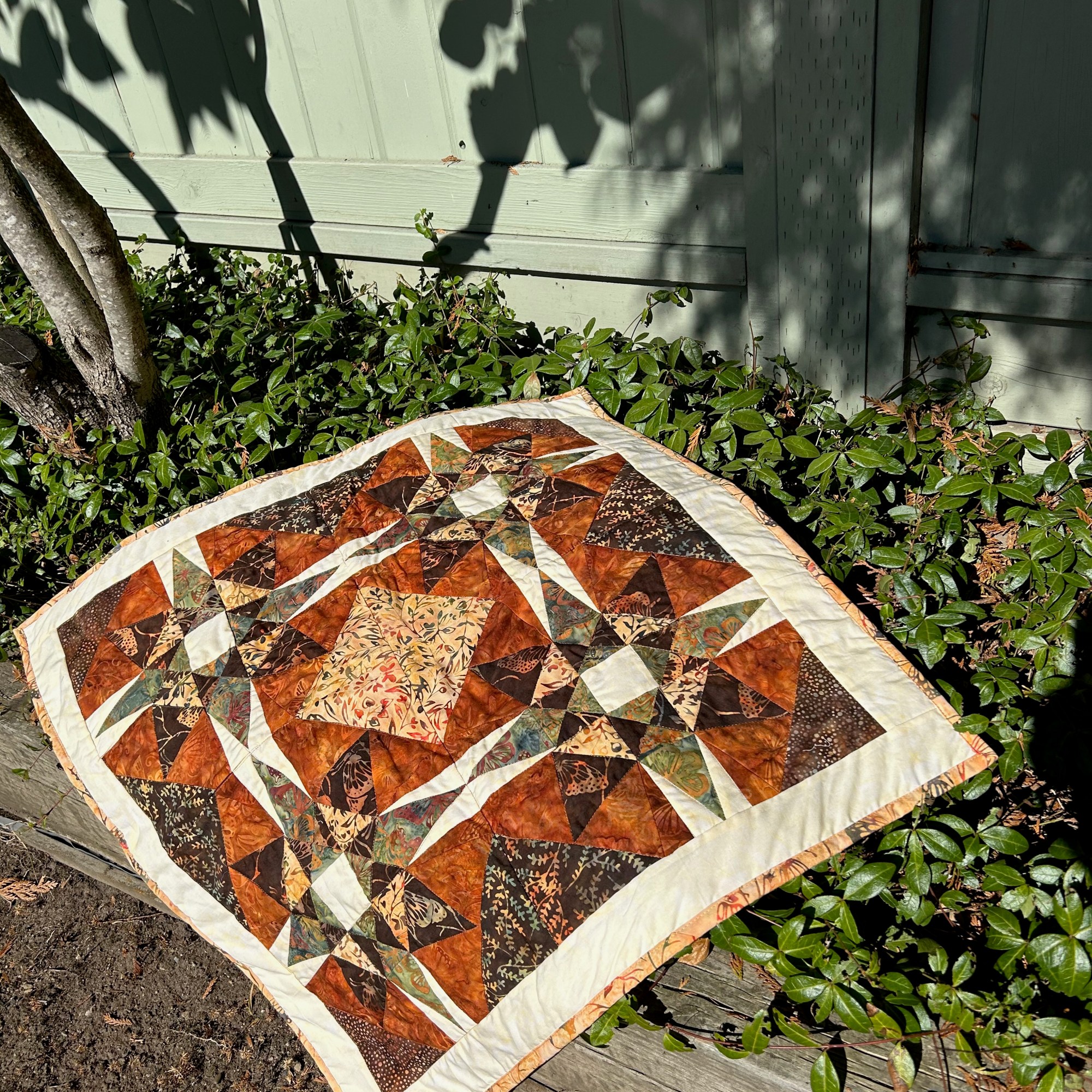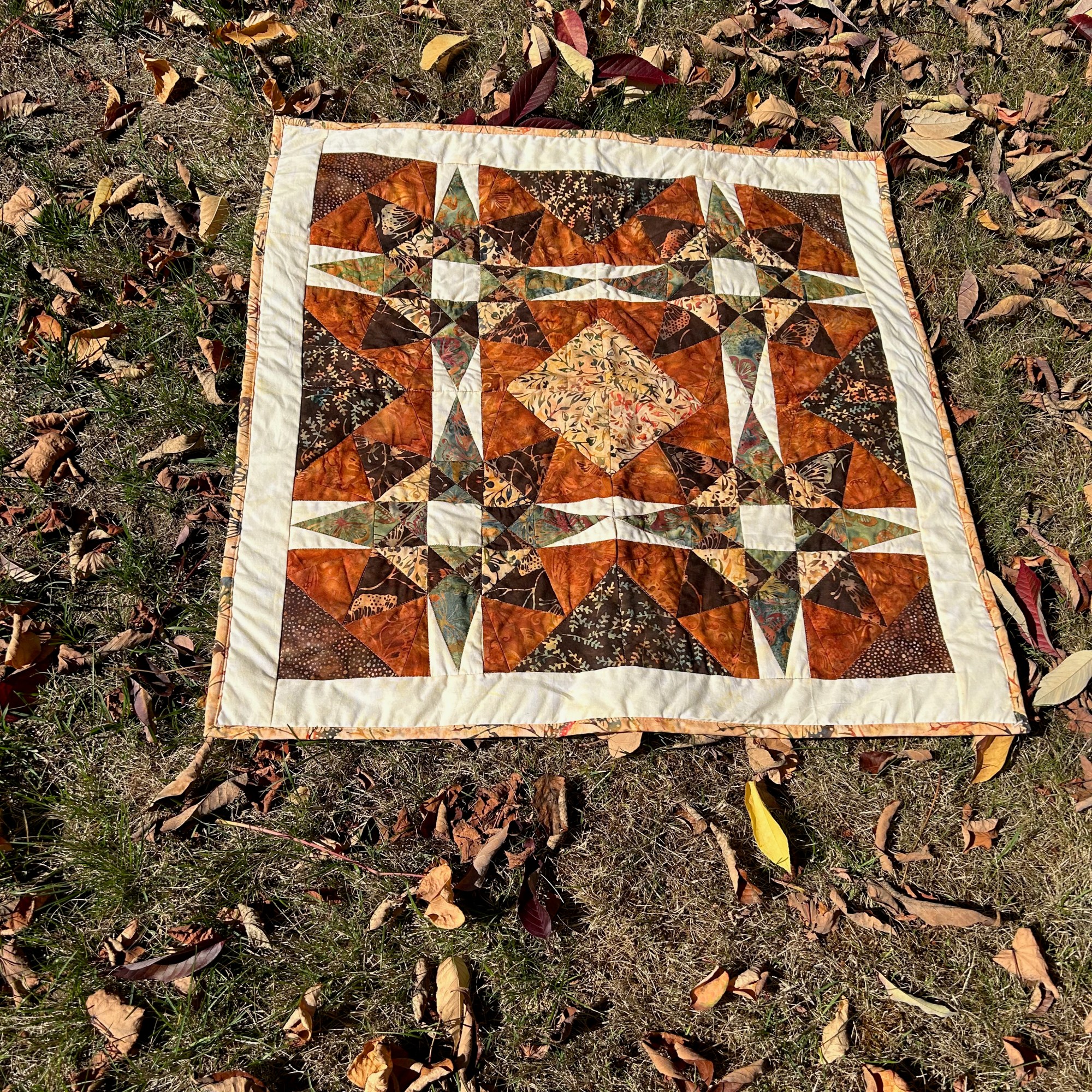 Well, no! It was too busy … and I hated it. And I didn’t take any pictures of the not-so-nice blocks. So I cut more triangle blocks out of white fabric and came up with this quilt: