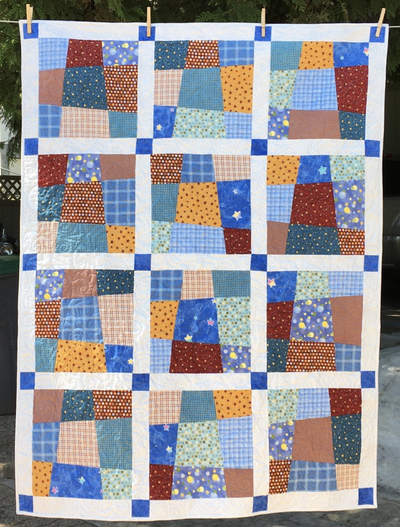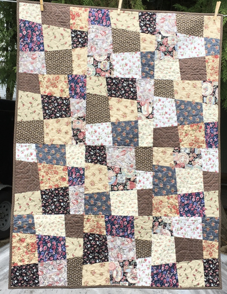 This is the quilt that had the left-overs that I used for the above quilt. There were 2 fat quarters that I did not use in the original quilt … one was a mini panel with the blocks of animals and the other was the white /with leaves that is on the outside of the quilt … it was a perfect place to use these fabrics up!