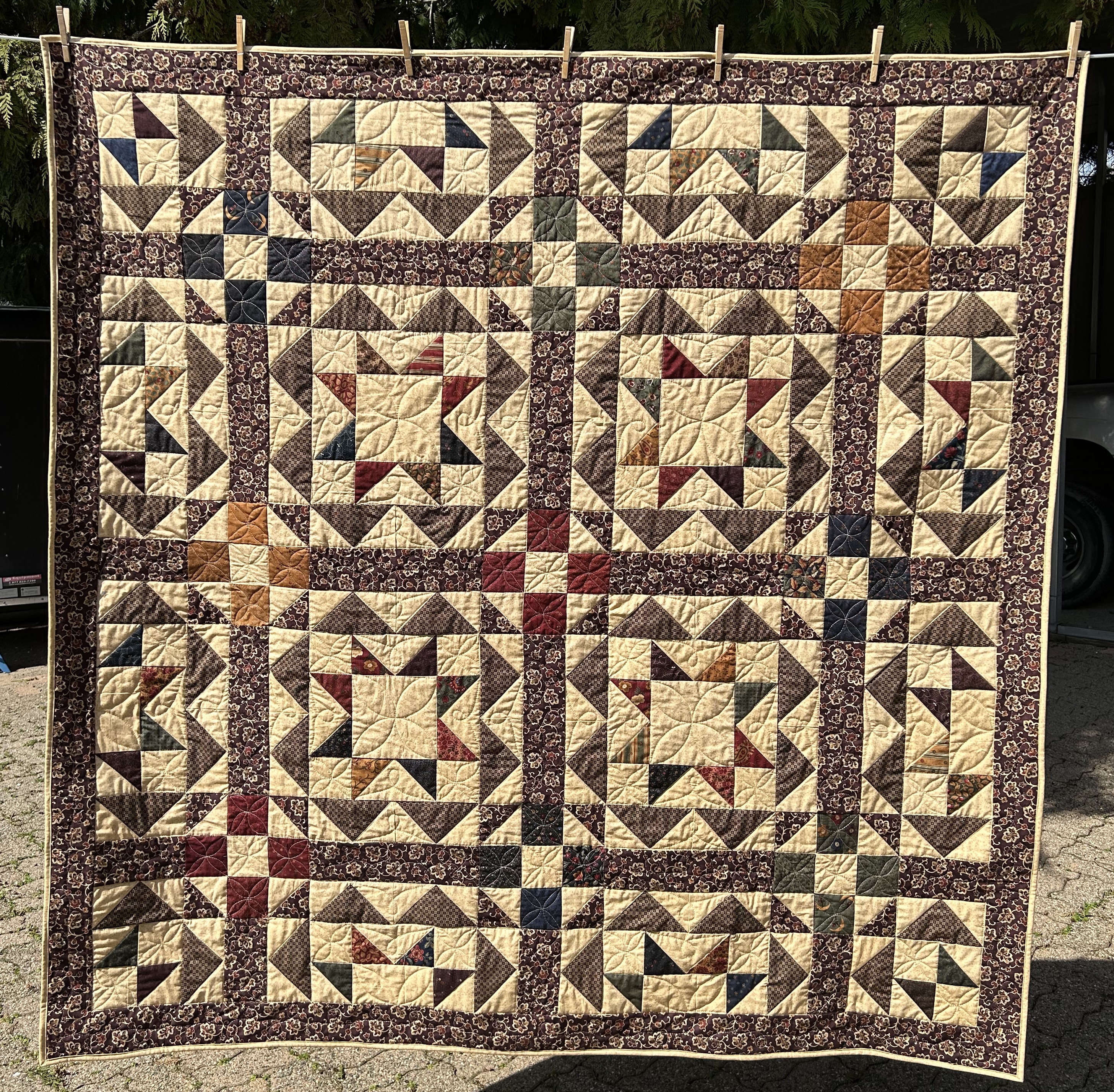 The collection is “Sandalwood” designed by Kathy Engle for Kari Nichols of Quilting Renditions. And the collection is paired with 2 yards of Dijon (from Opulent Oranges) and 2 yards of Mocha (from Neutrals).