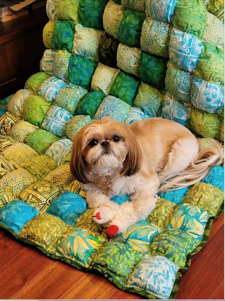 My Brother in Law, Dale, LOVES puffy quilts! He Loves bright and cheerful quilts. I gifted him the puff quilt that I made for the February Island Batik challenge. Obviously, their little dog, Brûlée, loves it as well! You can read more about this Puff quilt HERE.