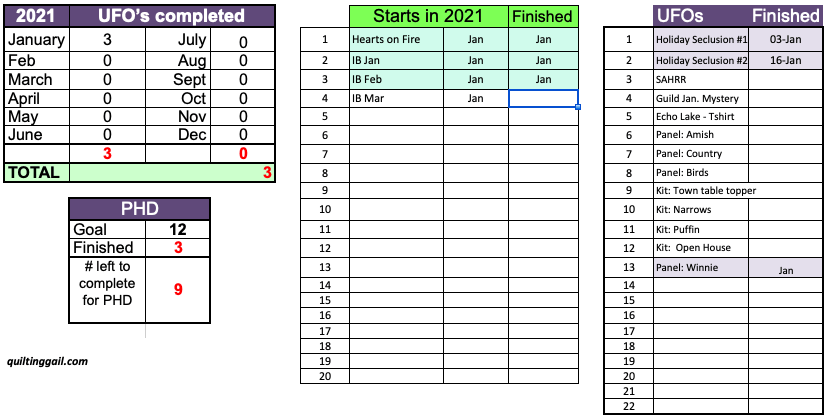 How are you doing with your PHD in 2021? So far I have 3 UFOs completed, but I feel like I’m cheating. Two of them (the Holiday Seclusion Mysteries) were started in December and were easy finishes. The Winnie the Pooh panel was a quick finish as well. I’m trying to go through my panels and get them quilted and gone. All of my New Starts, except for the March Island Batik project are completed. So, there isn’t any new UFOs developing in that area!