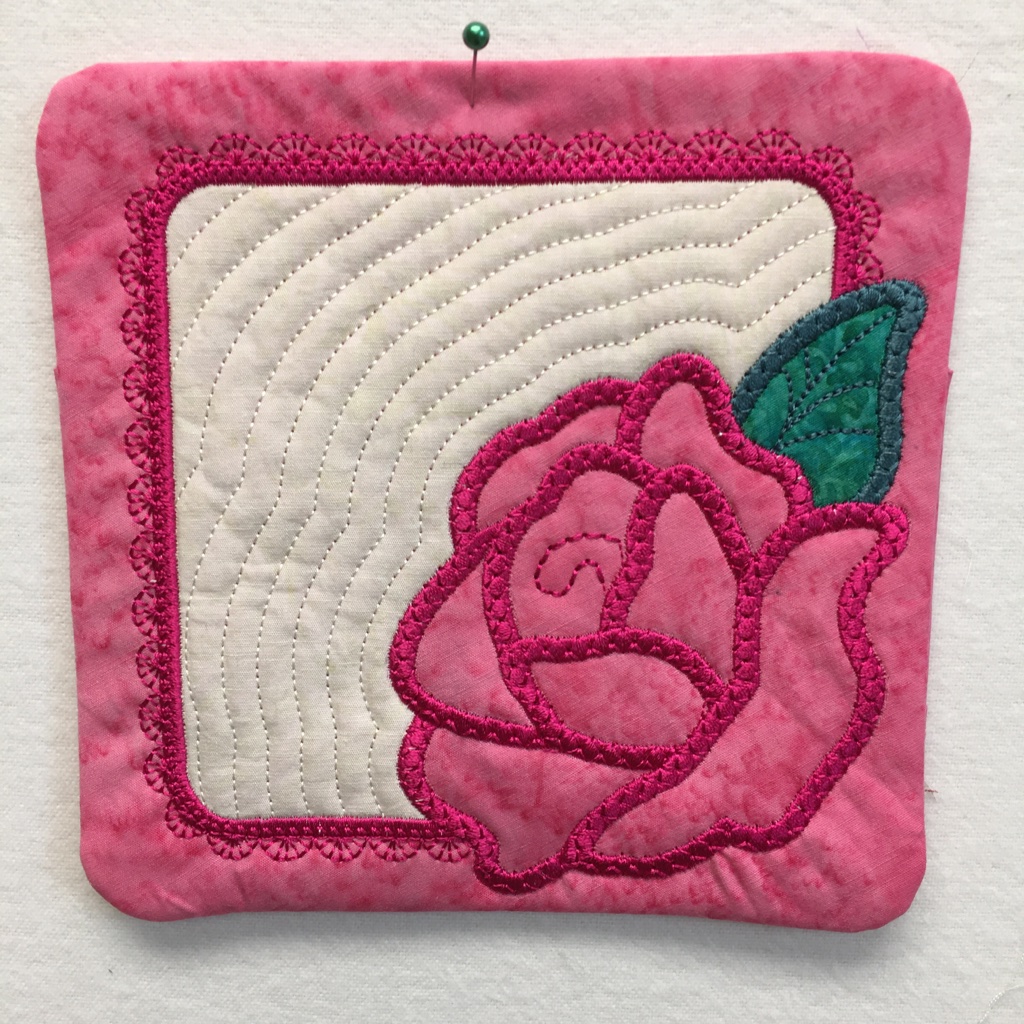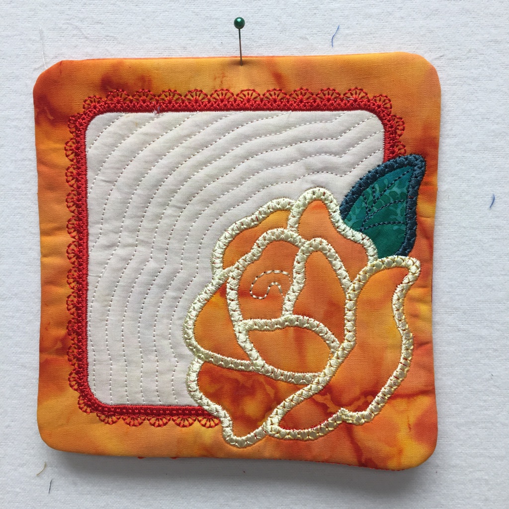 This coaster was made with a free pattern from Kreative Kiwi … Island Batik fabrics, Hobbs Batting and made in the hoop on my embroidery machine.
