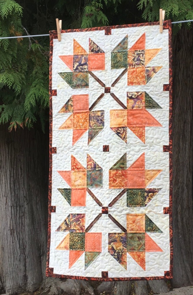 This Table runner was made with scraps of Island Batik fabric … mostly from the Autumn Wings collection. Quilted with Aurifil thread, Hobbs Batting and Schmetz needles.